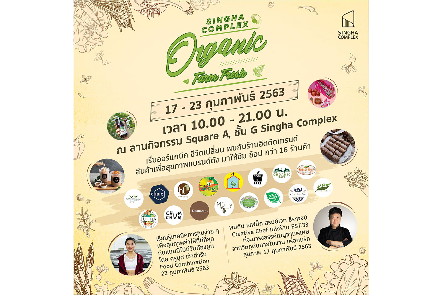 เพื่อสุขภาพที่ดีอย่างแท้จริง ในงาน Singha Complex Organic Farm Fresh ที่จัดระหว่างวันที่ 17-23 ก.พ. 2563 ณ ลานกิจกรรม Square A ชั้น G โครงการสิงห์ คอมเพล็กซ์ โดยพบกับร้านจำหน่ายสินค้า อาหาร และเครื่องดื่มออร์แกนิค จากแบรนด์ดังมากมายที่ยกขบวนมาให้ชิม ช้อป กว่า 16 ร้าน อาทิ ผักสดพื้นบ้าน กว่า 100 ชนิดจากวินเทจ ฟาร์มดี, น้ำมัลเบอร์รี่ ผสมเนื้อมัลเบอร์รี่ เจ้าแรกแห่งประเทศไทย จาก Mully, บะหมี่ผักโมโรเฮยะ จากฮาร์โมนีโลฟ์ฟาร์ม เขาใหญ่, ข้าวโพดนมสดฮอกไกโด จาก Grace Greenfarm, ชานมไข่มุก สูตร Low Fat จาก Boba Fit, ขนมปังโฮลวีตธัญพืช 19 ชนิด จาก Cubic, คุ้กกี้เอสเพรสโซ่ จาก Eat one cup, น้ำส้มคั้นสด จาก Juicena และเยลลี่บุกผลไม้ผสมเมล็ดเจีย จาก Chum Chum เป็นต้น