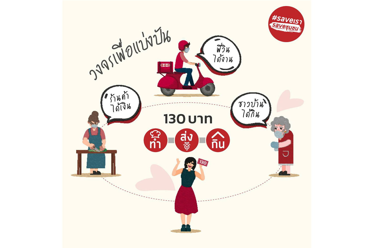 โครงการ 130 บาท ทำ-ส่ง-กิน โดย saveเราsaveชุมชน นำโดยทยา ทีปสุวรรณ ภรรยานายณัฎฐพล ทีปสุวรรณ รัฐมนตรีว่าการกระทรวงศึกษาธิการ เกิดจากแนวคิดการแบ่งปันจาก “คนมีสู่คนที่เดือดร้อน” และสร้างรายได้หมุนเวียนในพื้นที่ด้วยการจ้างงาน ภายใต้ความปลอดภัย เว้นระยะห่าง โดยนำระบบ cashless payment มาใช้ตั้งแต่ต้นทางถึงปลายทาง รวมระยะเวลา 15 วัน ตั้งแต่ 11-25 พฤษภาคมนี้