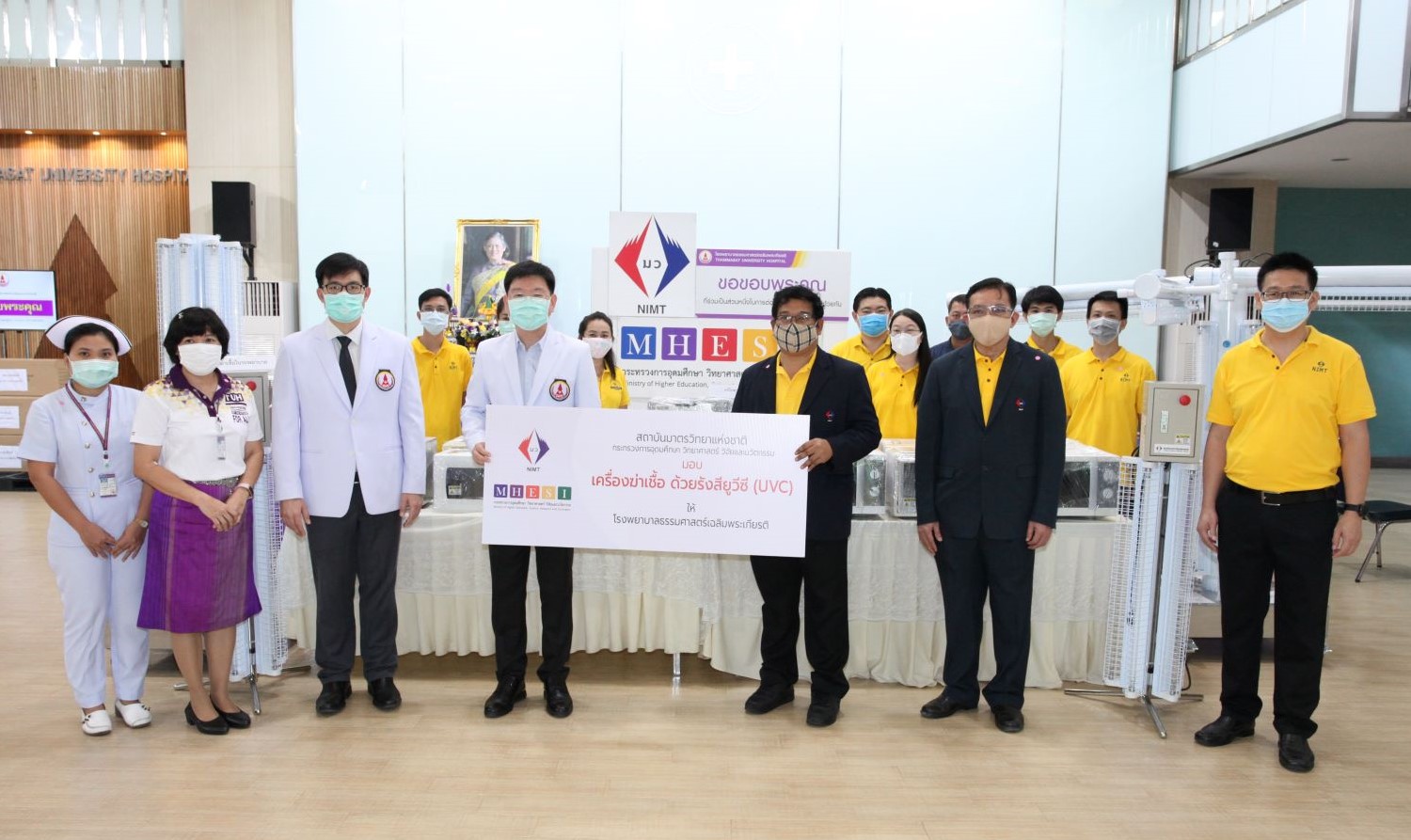 ซึ่งเป็นเครื่องต้นแบบเพื่อลดความเสี่ยงในการติดเชื้อไวรัสโคโรนา 2019 (COVID-19) และเชื้อโรคอื่นๆ ให้แก่บุคลากรทางการแพทย์และเจ้าหน้าที่ของโรงพยาบาล โดยทีมพัฒนาของ มว. ได้ทำการออกแบบและใช้องค์ความรู้ด้านมาตรวิทยาเข้าช่วยทดสอบเพื่อพัฒนาเครื่องมือให้มีคุณภาพได้มาตรฐาน ตรงกับความต้องการ สามารถนำไปใช้ประโยชน์ได้อย่างเหมาะสม และมีประสิทธิภาพ โดยนายอนุสรณ์ ทนหมื่นไวย รองผู้อำนวยการ และ ร.ท.อุทัย นรนิ่ม ผู้ช่วยผู้อำนวยการ มว. พร้อมด้วยคณะผู้บริหารและทีมนักมาตรวิทยาผู้ออกแบบและพัฒนาเครื่องต้นแบบดังกล่าวได้เข้ามอบเครื่องฆ่าเชื้อด้วยรังสี UVC ทั้งหมด 3 รายการ ได้แก่ เครื่องฆ่าเชื้อในห้องผู้ป่วยรวมโรงพยาบาลสนาม จำนวน 2 เครื่อง เครื่องฆ่าเชื้อในรถพยาบาลจำนวน 2 เครื่อง และตู้ฉายรังสียูวีซีจำนวน 15 เครื่อง ให้แก่ รศ.นพ.พฤหัส ต่ออุดม ผู้อำนวยการ และ ผศ.นพ.ปรีดิ์ นิมมานนิตย์ ผู้ช่วยรองผู้อำนวยการ ฝ่ายการคลัง โรงพยาบาลธรรมศาสตร์เฉลิมพระเกียรติ ณ บริเวณห้องโถงชั้น 1 อาคาร ม.ร.ว. สุวพรรณ สนิทวงศ์ โรงพยาบาลธรรมศาสตร์เฉลิมพระเกียรติ จ.ปทุมธานี