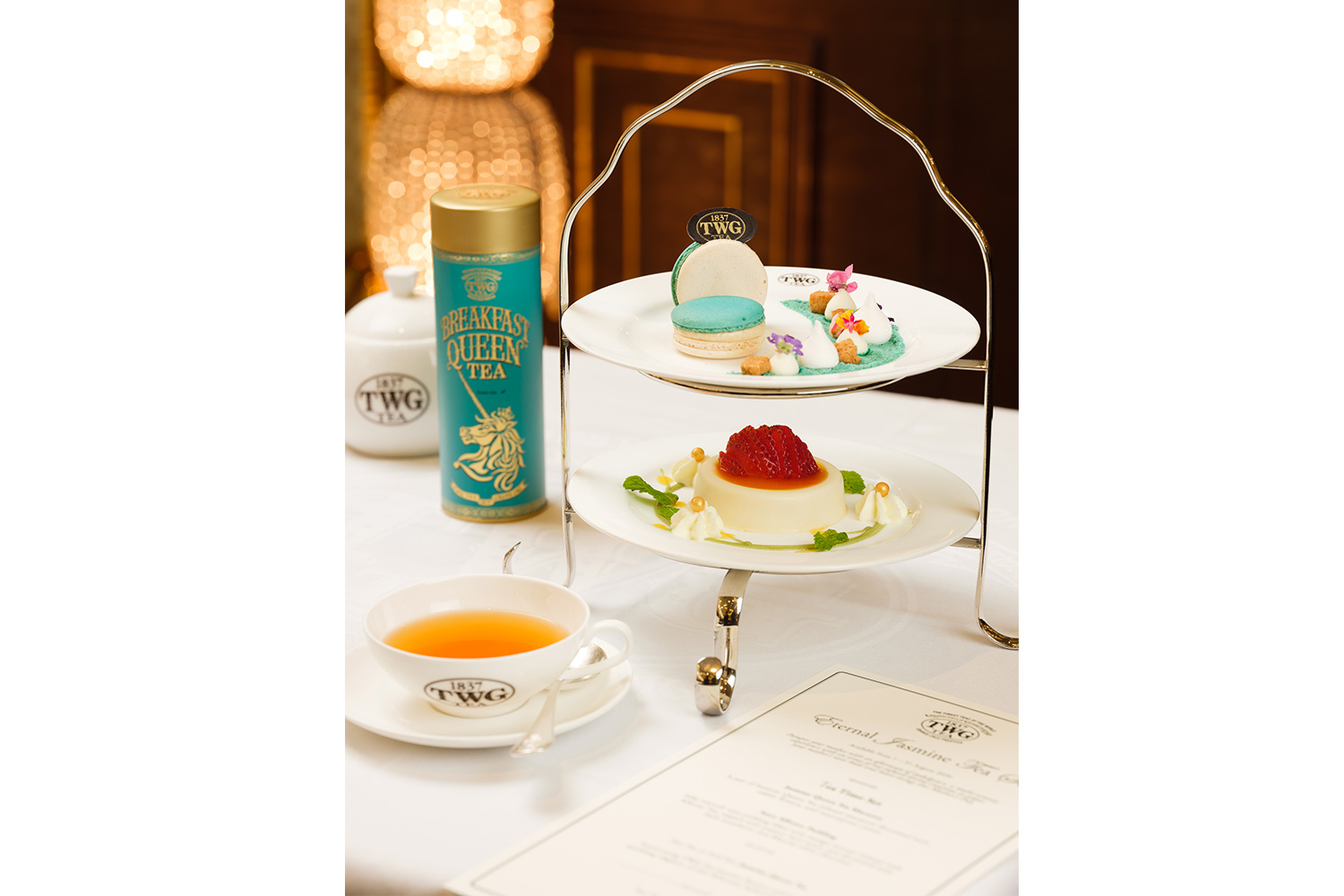 ชุดน้ำชาเซ็ตนี้ประกอบไปด้วย “มาการอง จัสมิน ควีน ที” (Jasmine Queen Tea Macaron) มีส่วนผสมของชา จัสมิน ควีน ที ชาปรุงผสมพิเศษอย่างประณีตของชาเขียวกับดอกมะลิที่ส่งกลิ่นหอมยาวนานน่าจดจำ ตกแต่งด้วยดอกไม้ที่สามารถรับประทานได้ (Edible flower) เคียงคู่ด้วย เมอแรงค์ ครัมเบิ้ล และมาสคาร์โปนครีมชีส