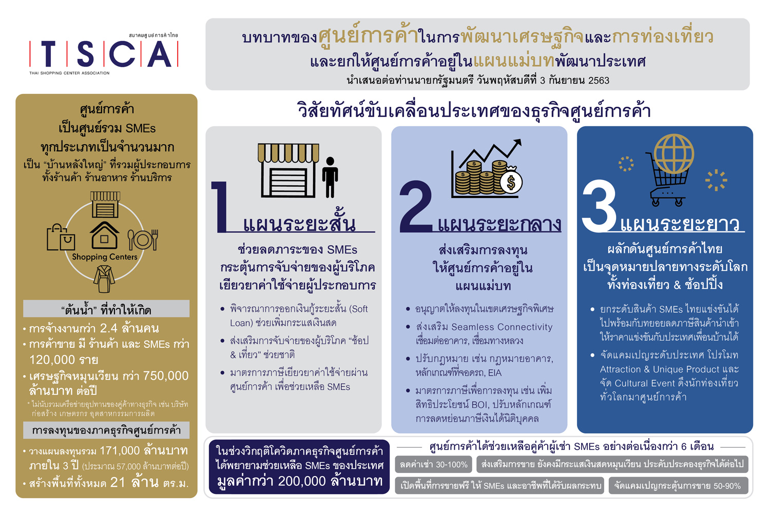 1. แผนระยะสั้น: ส่งเสริมธุรกิจเอสเอ็มอี ให้สามารถกลับมาค้าขายได้ คงการจ้างงาน และกระตุ้นการจับจ่ายใช้สอย ด้วยมาตรการออกเงินกู้ดอกเบี้ยต่ำ, ส่งเสริมโครงการช้อปและเที่ยวช่วยชาติ โดยอนุมัติมาตรการ “ชิม ช้อป ใช้” แจก 3,000 บาทต่อคน พร้อมขยายมายังผู้ค้ารายย่อยในศูนย์อาหาร (Food Center) ให้สามารถเข้าร่วมได้, พิจารณาอนุมัติมาตรการเยียวยาค่าใช้จ่ายผ่านศูนย์การค้าเพื่อช่วยเหลือเอสเอ็มอีต่อไป ตามข้อเสนอมาตรการเยียวยาโควิดทั้งด้านภาษีและค่าใช้จ่ายๆ ตามจดหมายที่สมาคมฯ เคยนำเสนอเมื่อวันที่ 15 เม.ย. และ 29 มิ.ย. 2563 พร้อมขยายระยะเวลามาตรการช่วยเหลือด้านการลงทุน และต่ออายุการลดภาษีที่ดินและสิ่งปลูกสร้างในอัตรา 90% ออกไปถึงปี 2566