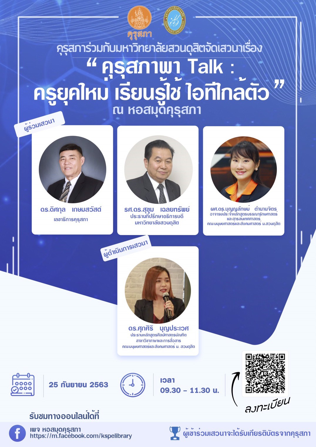 คุรุสภาร่วมกับมหาวิทยาลัยสวนดุสิต ขอเชิญเข้าร่วม กิจกรรมเสวนา คุรุสภาพา Talk หัวข้อ "ครูยุคใหม่ เรียนรู้ใช้ ไอทีใกล้ตัว"