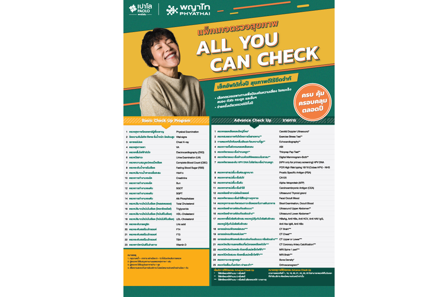 แพ็กเกจตรวจสุขภาพมิติใหม่ “ALL YOU CAN CHECK” ถูกออกแบบมาเพื่อตอบรับพฤติกรรมผู้คนที่เปลี่ยนไปสู่ยุคนิวนอร์มอล ซึ่งเป็นยุคของคนใส่ใจสุขภาพดี ให้คนทุกเพศ ทุกช่วงวัย เข้าถึงการตรวจสุขภาพครอบคลุมทุกระดับทั้ง Basic check-up การตรวจสุขภาพทั่วไป, advanced check-up การตรวจเฉพาะทางเพื่อป้องกันความเสี่ยง โรคมะเร็ง โรคทางสมอง โรคหัวใจ โรคกระดูก การตรวจ MRI, CT Scan ตามการวินิจฉัยของแพทย์ ฯลฯ”