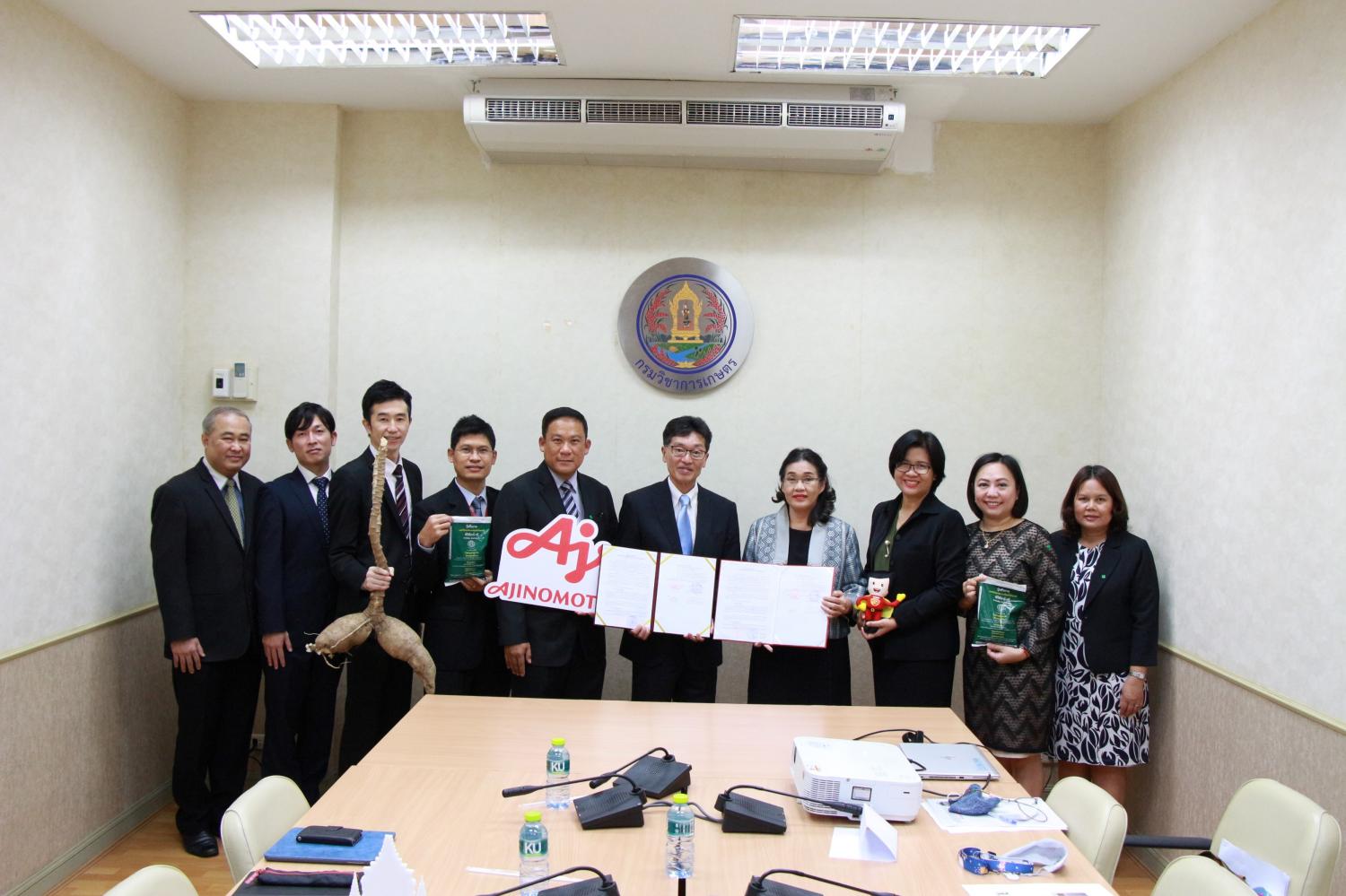 เมื่อเร็วๆ นี้ มร.ทะคากิ อะระชิดะ รองกรรมการผู้จัดการใหญ่ บริษัท อายิโนะโมะโต๊ะ (ประเทศไทย) จำกัด (ที่ 5 จากขวา) ร่วมลงนามในสัญญาการอนุญาตให้ใช้สิทธิ “สูตรและกรรมวิธีการผลิตปุ๋ยชีวภาพ พีจีพีอาร์สำหรับอ้อยและมันสำปะหลัง” กับกรมวิชาการเกษตร โดยมี พิเชษฐ์ วิริยะพาหะ อธิบดีกรมวิชาการเกษตร เป็นผู้ร่วมลงนาม ภายใต้ความร่วมมือนี้ บริษัทฯ จะได้รับสิทธิในการพัฒนา ผลิต และจำหน่ายปุ๋ยชีวภาพ PGPR ในราคาที่เหมาะสม เพื่อให้เพียงพอต่อความต้องการของเกษตรกรไทย เป็นระยะเวลา 5 ปี พิธีลงนามสัญญา จัดขึ้น ณ ห้องประชุม กรมวิชาการเกษตร