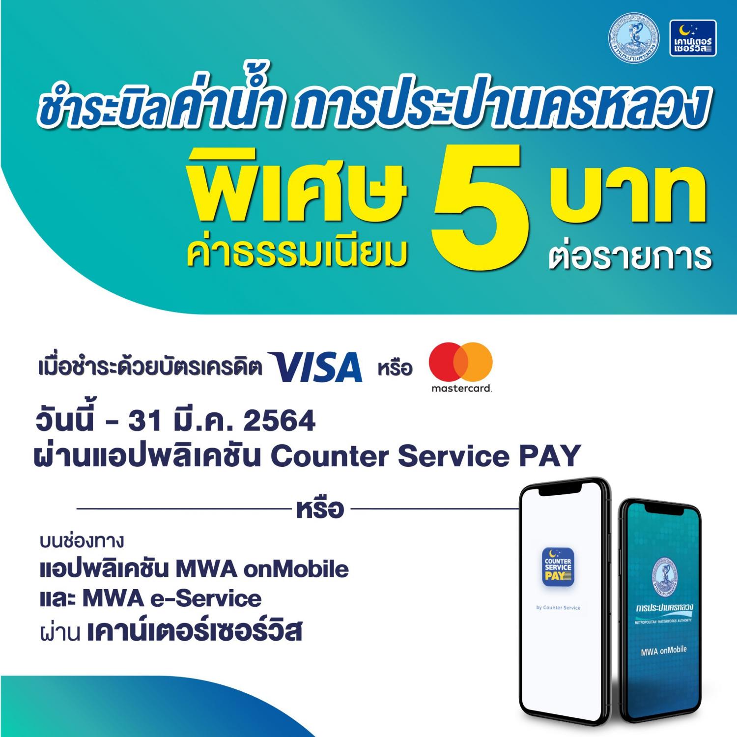 การประปานครหลวง (กปน.) ร่วมกับ บริษัท เคาน์เตอร์เซอร์วิส จำกัด จัดโปรโมชันพิเศษ ลดค่าธรรมเนียมการชำระเงินค่าน้ำประปา ด้วยบัตรเครดิต (วีซ่าการ์ด หรือมาสเตอร์การ์ด) ผ่าน แอปพลิเคชัน MWA onMobile และบนเว็บไซต์ (e-Service) ของ กปน. เหลือเพียง 5 บาทต่อรายการ (จากเดิม 8 บาทต่อรายการ) ตั้งแต่ บัดนี้ - 31 มีนาคม 2564 เพื่อช่วยลดภาระค่าใช้จ่ายของประชาชนในช่วงสถานการณ์วิกฤติ COVID-19