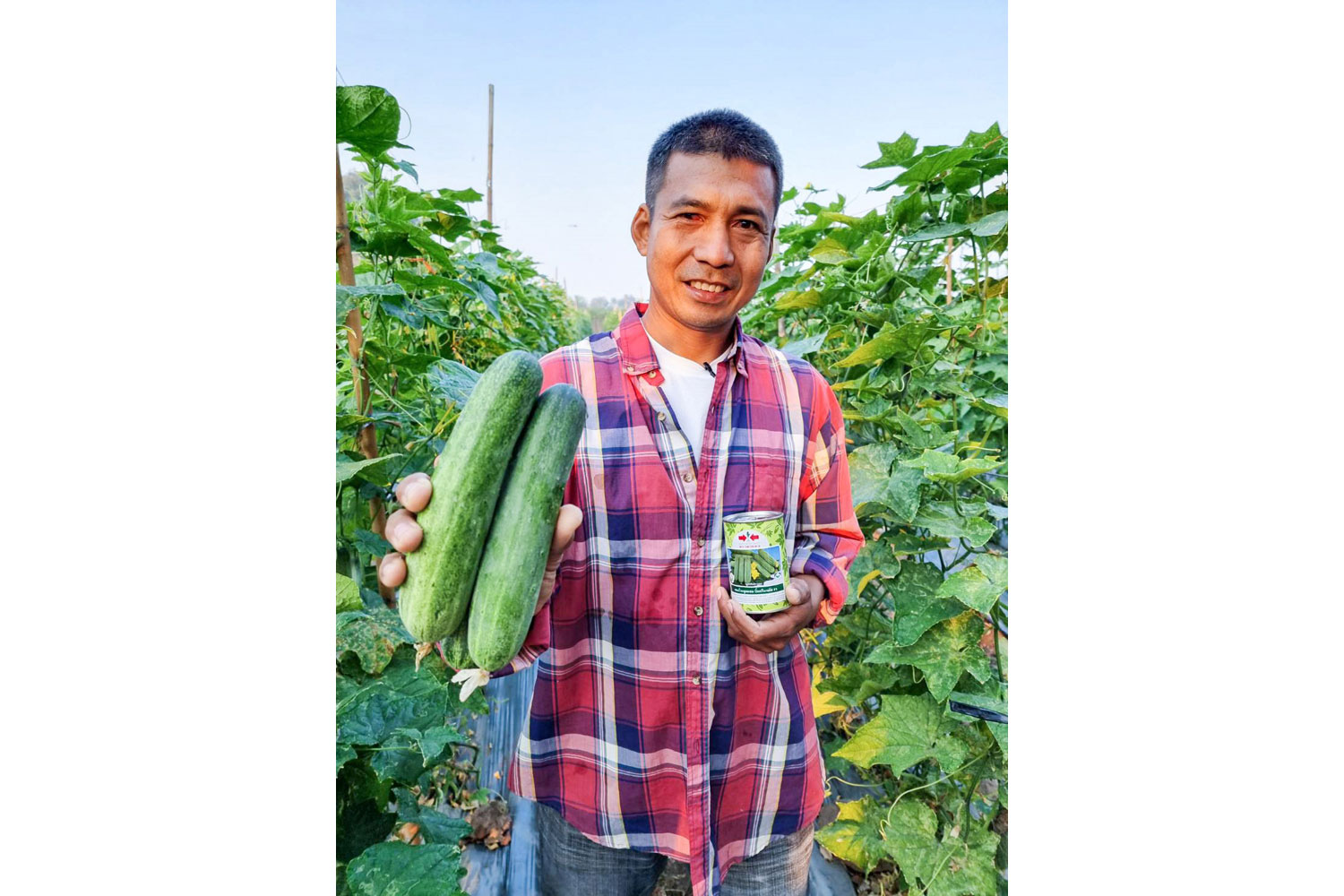 ทั้งนี้นอกจากการจัดการแปลงปลูกที่ดี และการบำรุงเสริมธาตุอาหารอย่างเพียงพอแล้ว อีกหนึ่งปัจจัยสำคัญที่ช่วยให้ แตงร้านเจริญเติบโตดี ทนทานต่อโรคและแมลงได้มาก และให้ผลผลิตเป็นที่ต้องการของตลาด คือ “การเลือกใช้เมล็ดพันธุ์ดี” โดยการปลูกแตงร้านรุ่นที่ผ่านมา คุณนุวิชญ์สรณ์ เลือกใช้แตงร้าน “พันธุ์บิ๊กกรีนพลัส” แตงร้านพันธุ์ดีจากเมล็ดพันธุ์ตราศรแดง เพราะมีลักษณะเด่นคือ “สีผิวเป็นสีเขียวสวยในทุกฤดูกาล เนื้อหนา น้ำหนักดี 4-5 ผลต่อกก. ผลทรงกระบอก จัดใส่ลงถุงได้ง่าย จึงเป็นที่ต้องการของตลาด ต้นแข็งแรง แตกแขนงดีผลคอดน้อย รสชาติไม่ขม ให้ผลดก เก็บเกี่ยวผลผลิตได้ไวเพียง 38-40 วัน หลังหยอดเมล็ด อีกทั้ง “พันธุ์บิ๊กกรีนพลัส” ยังสามารถทนต่อโรคใบหงิกและโรคราน้ำค้างได้อย่างดี จึงเหมาะกับทั้งเกษตรกรมือใหม่และเกษตรกรมืออาชีพ”