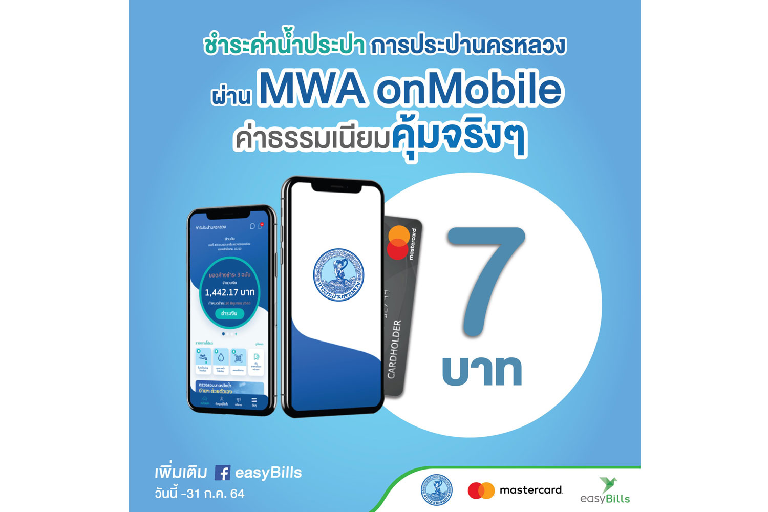 การประปานครหลวง (กปน.) ร่วมกับ บริษัท ทูซีทูพี (ประเทศไทย) จำกัด (2C2P) เชิญชวนทุกท่านร่วมกันลดความเสี่ยงจากการแพร่ระบาดของเชิ้อไวรัส COVID-19 จัดโปรโมชันพิเศษ ลดค่าธรรมเนียมการชำระเงินค่าน้ำประปา ด้วยบัตรเครดิตมาสเตอร์การ์ด ผ่านแอปพลิเคชัน MWA onMobile และบนเว็บไซต์ (e-Service) ของ กปน. เหลือเพียง 7 บาทต่อรายการ (จากเดิม 9 บาทต่อรายการ) สำหรับทุกยอดชำระ ตั้งแต่ บัดนี้ - 31 กรกฎาคม 2564