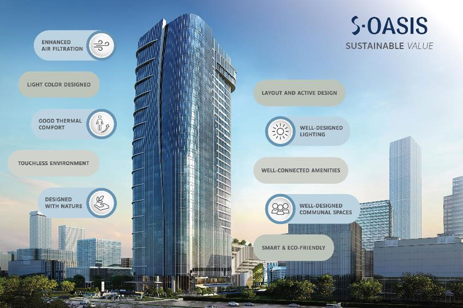 “เอส โอเอซิส” (S Oasis) คือ อาคารสำนักงานในฝันของคนรุ่นใหม่ โดยนางอรณีย์ พูลขวัญ ประธานเจ้าหน้าที่บริหาร ฝ่ายพัฒนาธุรกิจค้าปลีก และการพาณิชย์ บริษัท สิงห์ เอสเตท จำกัด(มหาชน) กล่าวถึงโครงการนี้ว่า เอส โอเอซิส ถูกพัฒนาขึ้นจากแนวคิดอาคารอัจฉริยะ และเป็นมิตรกับสิ่งแวดล้อม (Smart and Eco-friendly Building) เน้นการออกแบบเพื่อสร้างสภาพแวดล้อมให้เอื้อต่อการสร้างสรรค์งาน และบรรยากาศการทำงานที่มีชีวิตชีวา (Innovative Ecosystem) ซึ่งโครงการเอส โอเอซิส นอกจากจะตั้งอยู่ในทำเลที่มีศักยภาพสูงแล้ว การออกแบบได้ยึดตามมาตรฐาน LEED (Leadership in Energy & Environmental Design) ที่ให้ความสำคัญกับการอนุรักษ์พลังงาน และสิ่งแวดล้อม เลือกใช้วัสดุที่มีมลพิษต่ำ ควบคุมการก่อสร้างอย่างมีมาตรฐาน เพื่อเพิ่มความปลอดภัย ประสิทธิภาพในการทำงาน สู่การเป็น Sustainable Office ชั้นนำของไทย