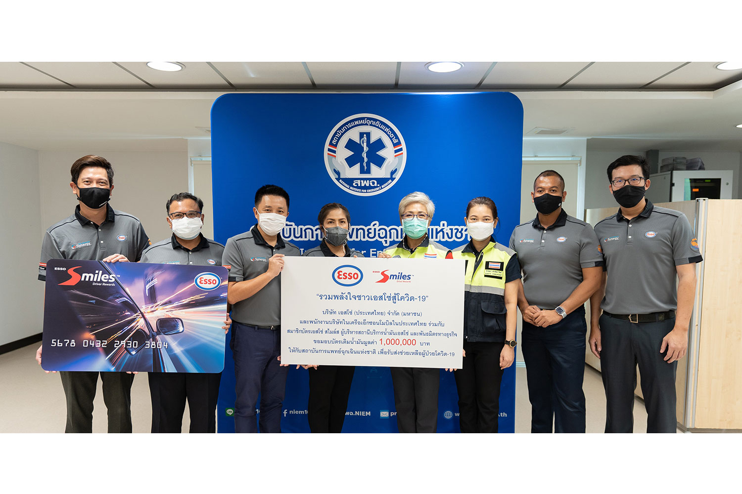 บริษัท เอสโซ่ (ประเทศไทย) จำกัด (มหาชน) และพนักงานบริษัทในเครือเอ็กซอนโมบิลในประเทศไทย ร่วมกับสมาชิกบัตรเอสโซ่ สไมล์ส ผู้บริหารสถานีบริการน้ำมันเอสโซ่ และพันธมิตรทางธุรกิจ มอบบัตรเติมน้ำมันเอสโซ่ มูลค่า 1,000,000 บาท ให้แก่ สถาบันการแพทย์ฉุกเฉินแห่งชาติ เป็นการเพิ่มเติมในโครงการ “รวมพลังใจชาวเอสโซ่สู้โควิด-19”
