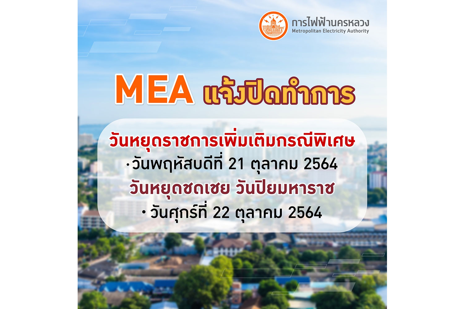 MEA หรือ การไฟฟ้านครหลวง จึงประกาศปิดทำการทุกแห่งตั้งแต่วันที่ 21 - 22 ตุลาคม 2564 โดยจะเปิดทำการและให้บริการตามปกติ ในวันจันทร์ที่ 25 ตุลาคม 2564 ระหว่างเวลา 07.30 - 15.00 น. (ยกเว้น ศูนย์บริการภาครัฐแบบเบ็ดเสร็จ หรือ Government Center ที่ปิดทำการตามนโยบายป้องกันเชื้อไวรัส COVID-19)