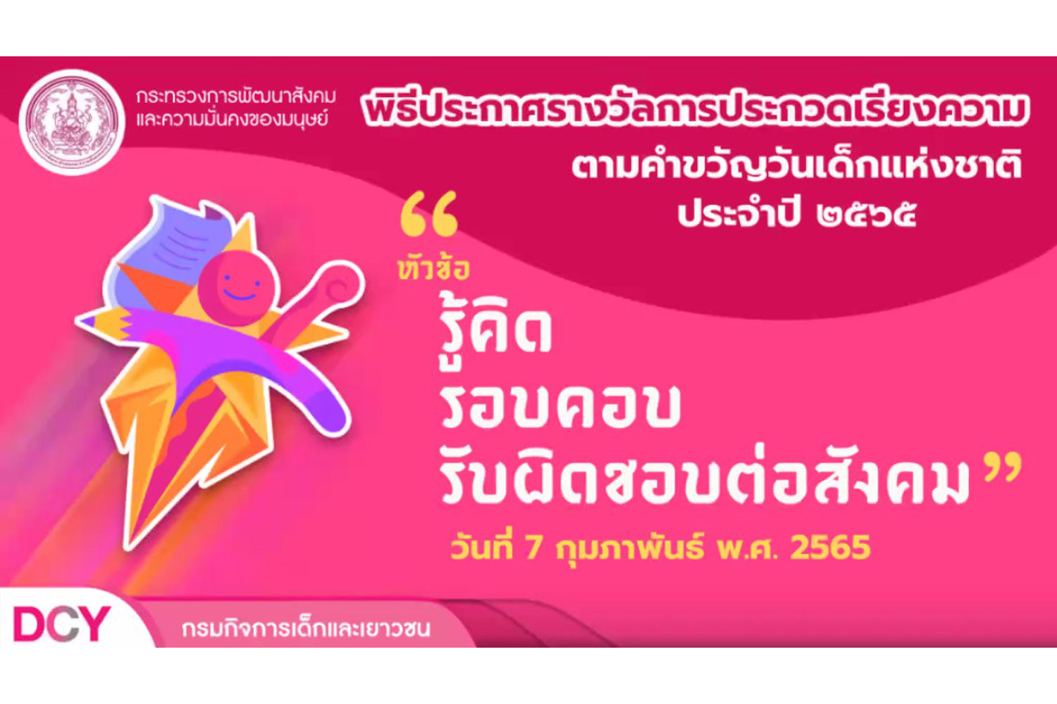 พม.โดยกรมเด็ก ฯ จัดพิธีประกาศรางวัลการประกวดเรียงความ เนื่องในวันเด็กแห่งชาติ ประจำปี 2565 หัวข้อ “รู้คิด รอบคอบ รับผิดชอบต่อสังคม”