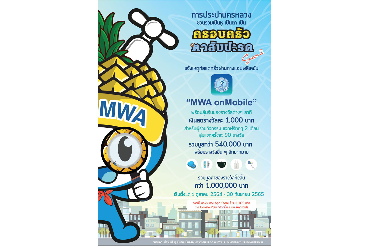 การประปานครหลวง (กปน.) ขอเชิญชวนประชาชนในพื้นที่ให้บริการของ กปน. ได้แก่ กรุงเทพมหานคร นนทบุรี และสมุทรปราการ ร่วมเป็นส่วนหนึ่งในโครงการ “ครอบครัวตาสับปะรด Season 2” ด้วยการร่วมกันสอดส่องดูแลและแจ้งปัญหาท่อแตกรั่ว เพียงลงทะเบียนผ่านแอปพลิเคชัน MWA onMobile และเมื่อพบเห็นท่อประปาแตกรั่ว สามารถแจ้งข้อมูลเกี่ยวกับท่อประปาแตกรั่ว หรือถ่ายรูปจุดที่ท่อประปาแตกรั่ว ส่งผ่านทางแอปพลิเคชัน MWA onMobile ได้ทันที เพื่อให้เจ้าหน้าที่ กปน. เข้าไปตรวจสอบและซ่อมแซมได้อย่างรวดเร็ว ตลอดจนช่วยเพิ่มประสิทธิภาพในการลดน้ำสูญเสียของ กปน.