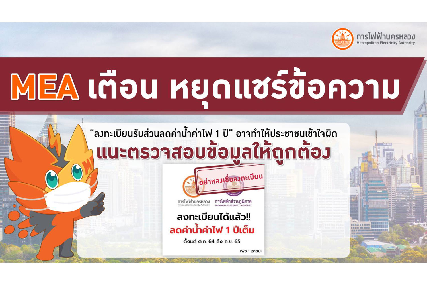 MEA เตือน หยุดแชร์ข้อความ “ลงทะเบียนรับส่วนลดค่าน้ำค่าไฟ 1 ปี” อาจทำให้ประชาชนเข้าใจผิด แนะตรวจสอบข้อมูลให้ถูกต้อง