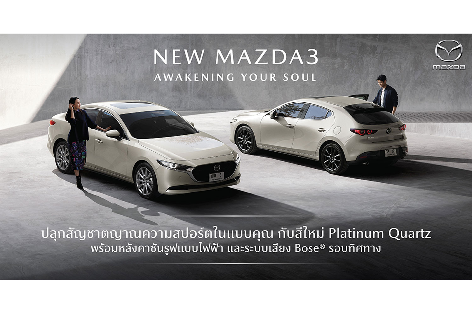 กรุงเทพฯ, ประเทศไทย – 14 กุมภาพันธ์ 2565 – มาสด้าเดินหน้ากระตุ้นตลาดต่อเนื่อง ส่ง New Mazda3 เก๋งยอดนิยม ต้นแบบแห่งความสง่างามดุจงานศิลปะชิ้นเอก ยนตรกรรมที่พร้อมปลุกสัญชาตญาณความสปอร์ตในตัวคุณให้มีชีวิต เจ้าของรางวัลรถยนต์ออกแบบยอดเยี่ยมของโลก และ Top 3 รถยนต์ยอดเยี่ยมของโลก ชูไฮไลท์สำคัญ คือ สมรรถนะการขับขี่ที่ดีเยี่ยม ด้วยเครื่องยนต์สกายแอคทีฟเบนซิน 2.0 ลิตร และเพิ่มอุปกรณ์อำนวยความสะดวกและความปลอดภัยครบครันยิ่งขึ้นตั้งแต่รุ่นเริ่มต้น เสริมภาพลักษณ์ความสปอร์ตหรูที่เหนือกว่ากับหลังคาซันรูฟแบบไฟฟ้าหนึ่งเดียวในตลาด พร้อมเติมเต็มเอกลักษณ์ที่โดดเด่นในแบบไม่ซ้ำใครกับสีภายนอกใหม่ บรอนซ์ แพลตทินั่ม ควอตซ์ มาพร้อมตัวถังสองรูปแบบทั้งซีดานและฟาสท์แบค ที่สะท้อนภาพลักษณ์และตอบโจทย์ไลฟ์สไตล์ของผู้ขับขี่ที่ลงตัว มอบความคุ้มค่าคุ้มราคาด้วยราคาจำหน่ายเริ่มต้นเพียง 979,000 บาท พร้อมโปรโมชั่นสุดพิเศษ กับดอกเบี้ย 1.99%1 และฟรีประกันภัยชั้นหนึ่ง Mazda Premium Insurance 1 ปี2 เชิญสัมผัสตัวจริงเสียงจริงได้แล้ววันนี้ที่โชว์รูมมาสด้าทั่วประเทศ และพร้อมส่งมอบรถใหม่ให้กับลูกค้าทันที