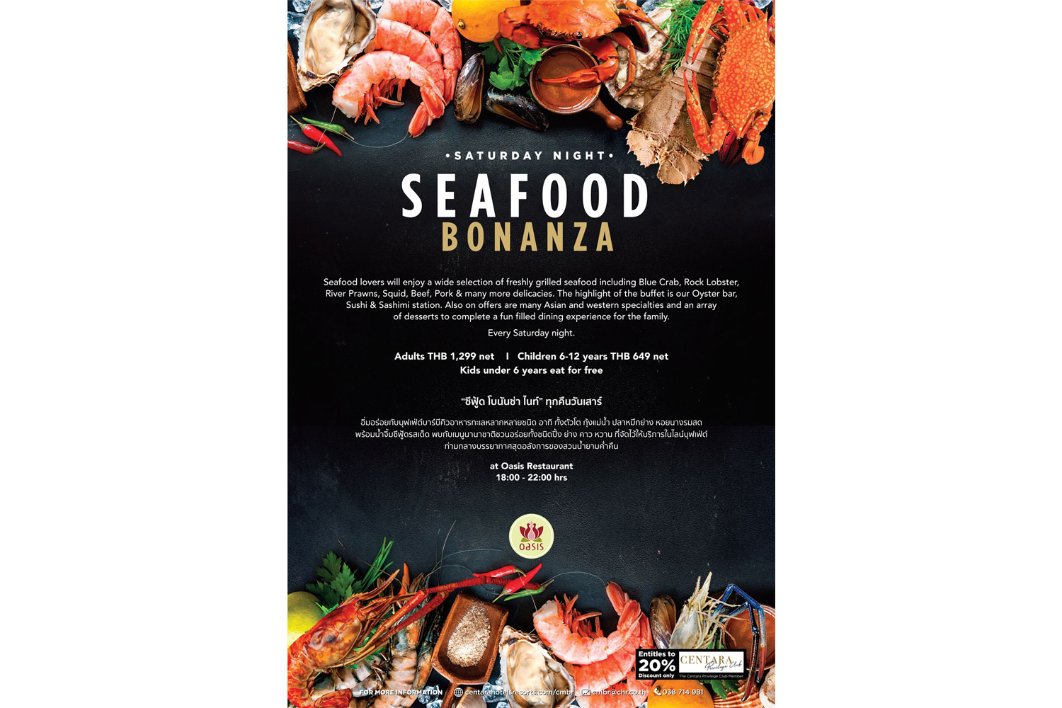 อิ่มอลังการมื้อค่ำ อาหารทะเลทุกคืนวันเสาร์ “บุฟเฟ่ต์ซีฟู้ด โบนันซ่า ไนท์” ห้องอาหารโอเอซิส เซ็นทาราแกรนด์มิราจ พัทยา