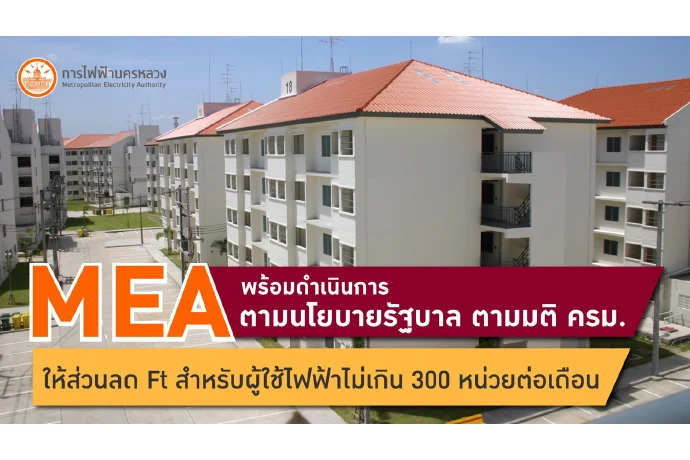 MEA พร้อมดำเนินการตามนโยบายรัฐบาล ตามมติ ครม. ให้ส่วนลด Ft สำหรับผู้ใช้ไฟฟ้าไม่เกิน 300 หน่วยต่อเดือน