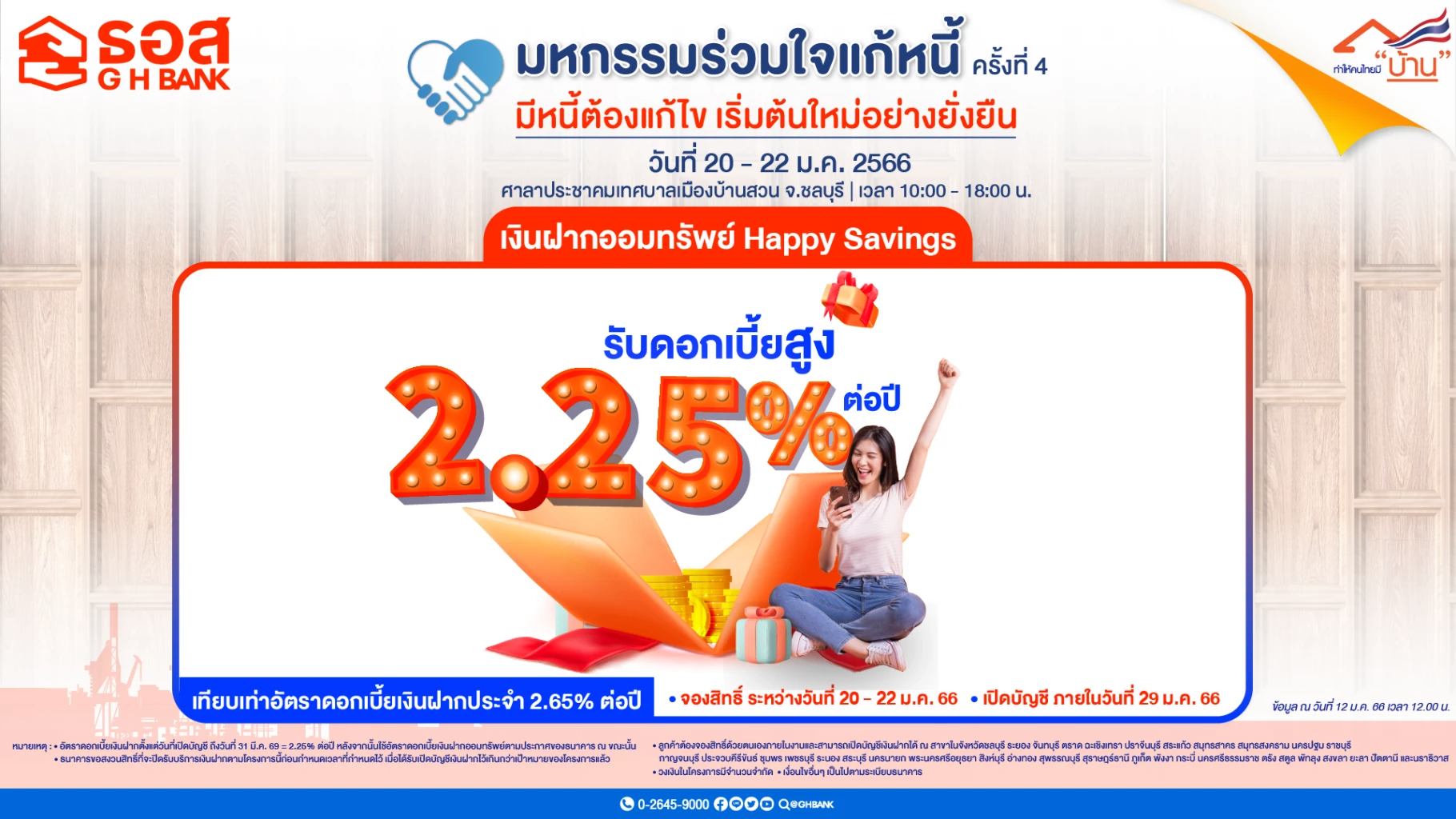 ธนาคารอาคารสงเคราะห์ (ธอส.) เอาใจคนรักการออม จัดทำผลิตภัณฑ์เงินฝากออมทรัพย์อัตราดอกเบี้ยสูง ที่งาน “มหกรรมร่วมใจแก้หนี้ มีหนี้ต้องแก้ไข เริ่มต้นใหม่อย่างยั่งยืน” สัญจร ครั้งที่ 4 ระหว่างวันที่ 20-22 มกราคม 2566 ณ ศาลาประชาคมเทศบาลเมืองบ้านสวน จ.ชลบุรี เพื่อให้ประชาชนมีทางเลือกในการออมมากขึ้น กับ เงินฝากออมทรัพย์ Happy Savings โดยผู้เปิดบัญชีจะได้รับอัตราดอกเบี้ยสูงถึง 2.25% ต่อปี (นับตั้งแต่วันที่เปิดบัญชีถึงวันที่ 31 มีนาคม 2569) พิเศษ! บุคคลธรรมดาได้รับการยกเว้นภาษีดอกเบี้ยเงินฝาก (อัตราดอกเบี้ยเทียบเท่ากับได้รับอัตราดอกเบี้ยเงินฝากประจำ 2.65% ต่อปี) พิเศษชั้นที่ 2!! จองสิทธิ์ภายในงานและเปิดบัญชี ตั้งแต่ 500,000 บาท ขึ้นไป ต่อรายการ รับฟรี กระเป่าสะพายใบเล็ก 1 ราย/1 ใบ ณ สาขาในจังหวัดที่ธนาคารกำหนดภายในวันที่ 29 มกราคม 2566 สอบถามรายละเอียดเพิ่มเติมได้ที่ ธอส.ทุกสาขาทั่วประเทศ G H Bank Call Center โทร 0-2645-9000 หรือ Facebook Fanpage ธนาคารอาคารสงเคราะห์ และติดตามข่าวสารของธนาคารได้ที่ Mobile Application : GHB ALL , Mobile Application : GHB ALL GEN และ www.ghbank.co.th