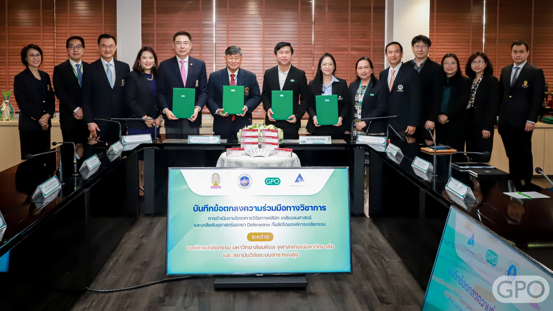 นพ.วิฑูรย์ ด่านวิบูลย์ ผู้อำนวยการองค์การเภสัชกรรม ลงนามบันทึกข้อตกลงความร่วมมือทางวิชาการเรื่องการดำเนินงานโครงการวิจัยทางคลินิก เภสัชจลนศาสตร์ และเภสัชพันธุศาสตร์ของยา Deferasirox กับ ศ.นพ.บรรจง มไหสวริยะ อธิการบดีมหาวิทยาลัยมหิดล ศ.ดร.บัณฑิต เอื้ออาภรณ์ อธิการบดีจุฬาลงกรณ์มหาวิทยาลัย และ ผศ.ดร.จรวยพร ศรีศศลักษณ์ รองผู้อำนวยการสถาบันวิจัยระบบสาธารณสุข เพื่อศึกษาประสิทธิผล ความปลอดภัย และคุณภาพชีวิตของผู้ป่วยโรคโลหิตจางธาลัสซีเมียที่มีภาวะเหล็กเกินที่ได้รับยา Deferasirox GPO ขององค์การเภสัชกรรม และศึกษาปัจจัยทางพันธุกรรมและปัจจัยทางคลินิกที่มีความสัมพันธ์กับการตอบสนองต่อยา Deferasirox GPO และ/หรือระดับยาในพลาสมา รวมถึงศึกษาเภสัชจลนศาสตร์ของยา Deferasirox GPO และพัฒนาแบบจำลองทางเภสัชจลนศาสตร์เชิงสรีรวิทยา สำหรับ ทำนายระดับยาในเลือดของผู้ป่วยโรคโลหิตจางธาลัสซีเมียชนิดพึ่งพาเลือดที่มีปัจจัยทางพันธุกรรมและปัจจัยทางคลินิกที่แตกต่างกัน ที่องค์การเภสัชกรรม เมื่อวันก่อน