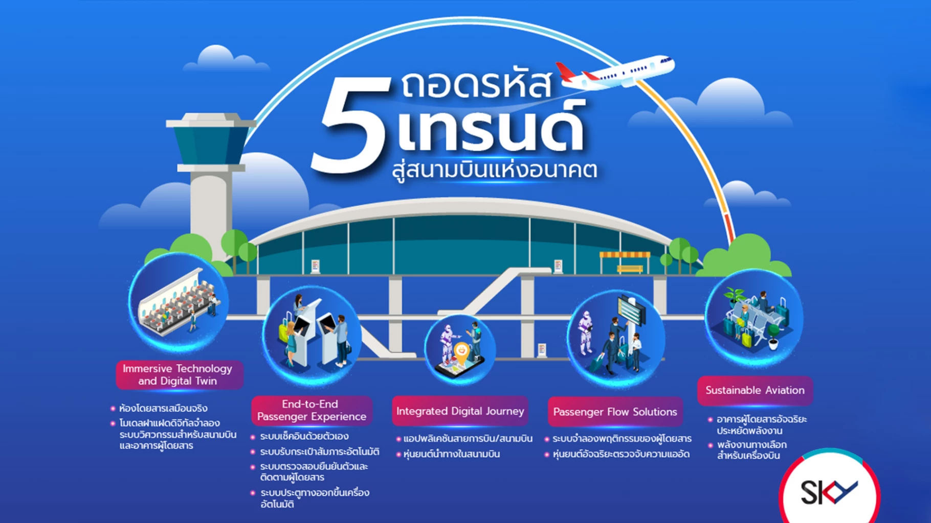 ขยล ตันติชาติวัฒน์ ประธานเจ้าหน้าที่สายงานการตลาด บริษัท สกาย ไอซีที จำกัด (มหาชน) หรือ SKY กล่าวว่า SKY ในฐานะผู้นำด้านการพัฒนาเทคโนโลยีที่เกี่ยวข้องกับอุตสาหกรรมการบิน (Aviation Tech) กำลังเร่งศึกษาและพัฒนาเทคโนโลยีที่ช่วยยกระดับการบริการภายในสนามบิน (Airport Services) เพื่อส่งมอบประสบการณ์ที่น่าจดจำให้แก่นักเดินทางตั้งแต่ลงจากเครื่องบิน ซึ่งที่ผ่านมาอุตสาหกรรมท่าอากาศยานทั่วโลกมีการนำเทคโนโลยีเข้ามายกระดับการให้บริการภายในสนามบินจนเกิดเทรนด์ใหม่ๆ ดังนี้