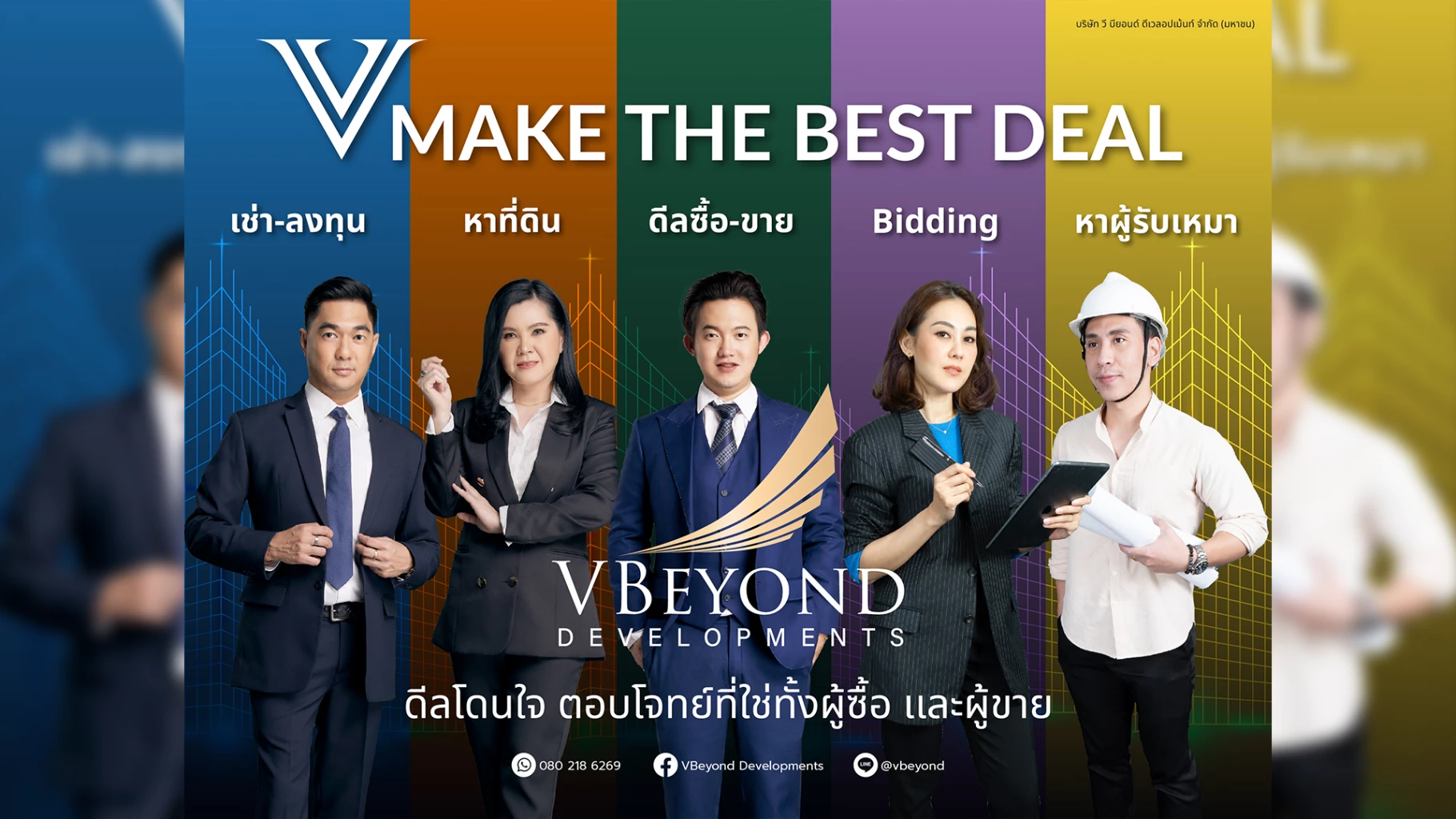 บริษัท วี บียอนด์ ดีเวลอปเม้นท์ จำกัด (มหาชน) เปิดตัวกลยุทธ์ใหม่กระตุ้นยอดขายไตรมาส 4 ภายใต้คอนเซ็ปต์ “V MAKE THE BEST DEAL” ให้เราเป็นเพื่อนคู่คิด ในทุกช่วงชีวิตของการอยู่อาศัย บริการที่ตอบโจทย์ทุกความต้องการเกี่ยวกับบ้านและคอนโด ทั้งซื้อ ขาย เช่า ซ่อมสร้าง ตกแต่ง ต่อเติม และลงทุน ครบจบในที่เดียว พร้อมรวมดีลทุกอย่างที่เกี่ยวกับอสังหาริมทรัพย์ไว้เยอะที่สุดในประเทศไทย เพื่อเป็น One Stop Service ทุกบริการด้านการอยู่อาศัยให้ลูกค้าของวีบียอนด์ทุกคน