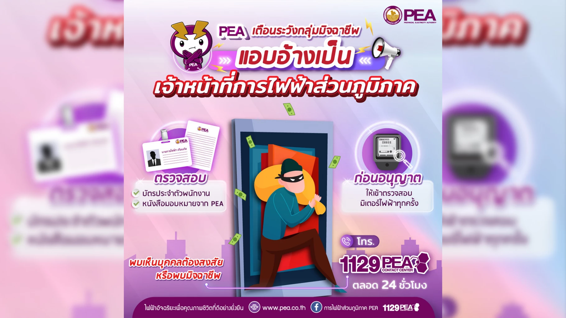 PEA เตือนระวังกลุ่มมิจฉาชีพ แอบอ้างเป็นเจ้าหน้าที่การไฟฟ้าส่วนภูมิภาค
