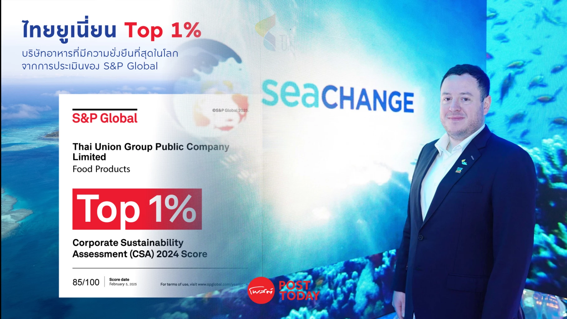 นายอดัม เบรนนัน ประธานเจ้าหน้าที่ด้านการพัฒนาที่ยั่งยืนและสื่อสารองค์กร บริษัท ไทยยูเนี่ยน กรุ๊ป จำกัด (มหาชน) กล่าวว่า การได้รับการจัดอันดับจาก S&P Global ในครั้งนี้ สะท้อนถึงความมุ่งมั่นในการดำเนินธุรกิจอย่างมีความรับผิดชอบ ภายใต้กลยุทธ์ความยั่งยืน SeaChange®2030 ที่มุ่งขับเคลื่อนการเปลี่ยนแปลงเชิงบวกให้เกิดขึ้นในการดำเนินงานตลอดห่วงโซ่คุณค่าของเราตั้งแต่การจัดหาวัตถุดิบ การผลิต จนส่งมอบผลิตภัณฑ์ให้ผู้บริโภคตลอดทั้ง สร้างความเป็นอยู่ที่ดีให้กับชุมชน สังคม และสิ่งแวดล้อมที่เราดำเนินการอยู่ ตามเป้าหมาย ‘Healthy Living, Healthy Oceans’ เพื่ออนาคตของผู้คนและโลกของเราอย่างยั่งยืน