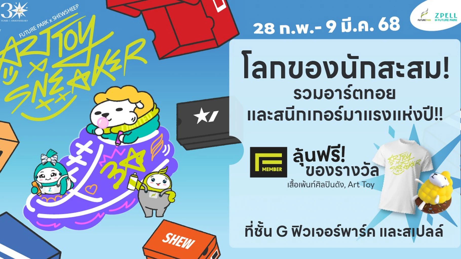 ศูนย์การค้าฟิวเจอร์พาร์คและสเปลล์ ชวนเที่ยวงาน ART TOY X SNEAKER สายสตรีทแวร์สุดฮอตปะทะสายอาร์ตทอยสุดฮิต รวม SNEAKER และ ART TOY จากศิลปินดังระดับท็อป และศิลปินชื่อดังอีกมากมาย พร้อมให้จุ่ม! Art Toy ศิลปินชื่อดัง! ระหว่างวันที่ 28 ก.พ. – 9 มี.ค. 2568 ชั้นจี ศูนย์การค้าฟิวเจอร์พาร์ค และสเปลล์