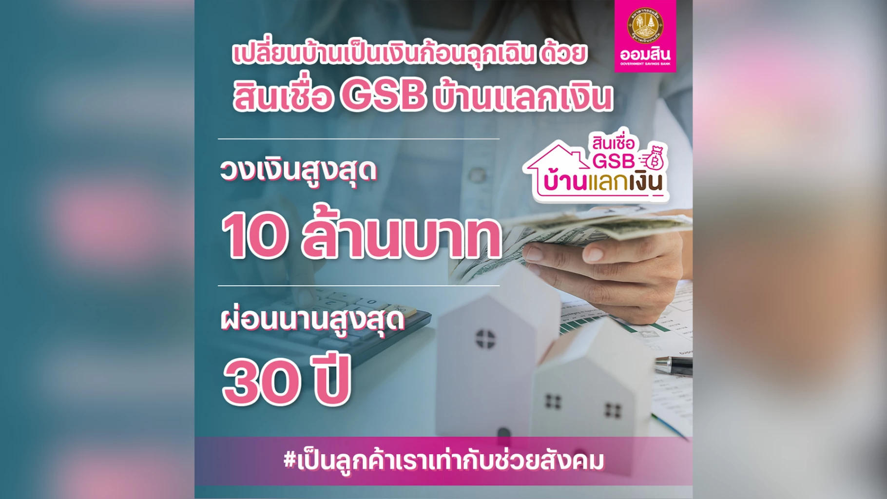 GSB บ้านแลกเงิน เปลี่ยนบ้านเป็นเงินก้อน ดอกเบี้ยต่ำ 3.59% วงเงินสูงสุด 10 ล้าน ผ่อนนาน 30 ปี สมัครภายใน 15 เม.ย. 68 อนุมัติ-ทำสัญญาภายใน 15 พ.ค. 68