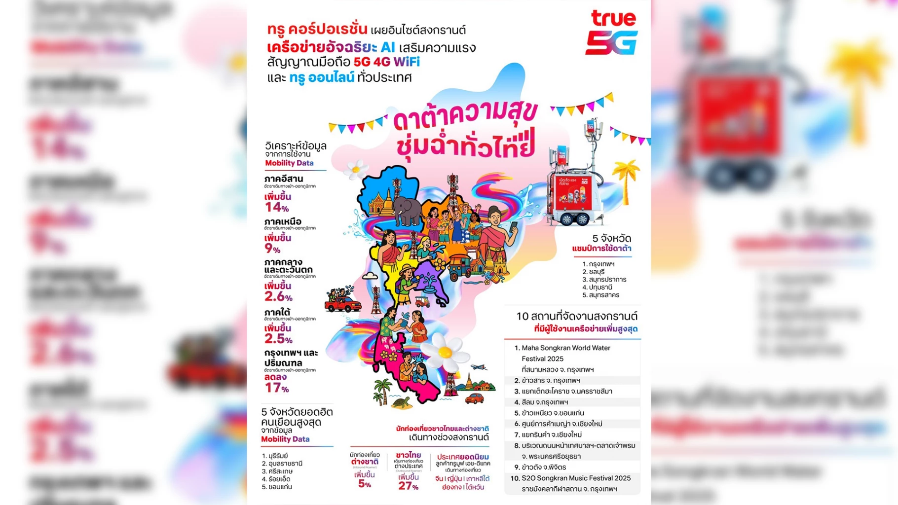 ทรู คอร์ปอเรชั่น เผยอินไซต์ความสุขเทศกาลสงกรานต์จากเครือข่ายอัจฉริยะ AI เสริมความแรงสัญญาณ 5G 4G WiFi และทรู ออนไลน์รองรับความสนุกชุ่มฉ่ำทั่วประเทศ