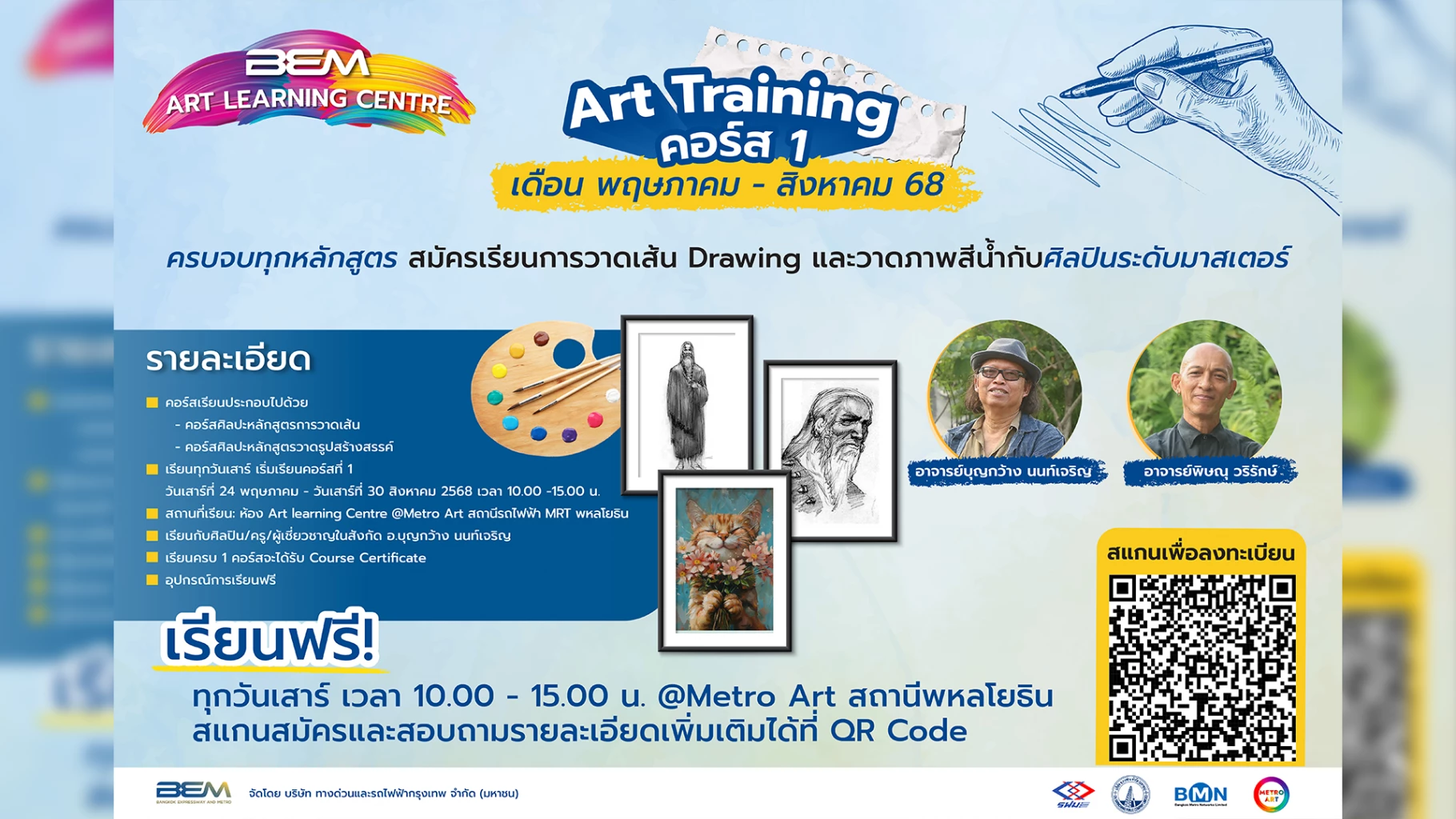 บริษัท ทางด่วนและรถไฟฟ้ากรุงเทพ จำกัด (มหาชน) หรือ BEM เปิดรับสมัครนักเรียนมัธยมศึกษา ปีที่ 4- 6 ที่ต้องการฝึกฝนฝีมือด้านศิลปะสำหรับการเข้าศึกษาต่อในระดับมหาวิทยาลัย เข้าร่วมคอร์ส Art Training ภายใต้โครงการ Art Learning Centre ฟรี!!! โดยเยาวชนที่ผ่านการคัดเลือกจะได้เรียน 2 หลักสูตรหลัก ได้แก่ การวาดเส้น จากอาจารย์พิษณุ วริรักษ์ อาจารย์พิเศษคณะสถาปัตยกรรมศาสตร์ มหาวิทยาลัยเทคโนโลยี เจ้าคุณทหาร ลาดกระบัง และ การวาดรูปสร้างสรรค์ จากอาจารย์บุญกว้าง นนท์เจริญ ศิลปินสีน้ำระดับโลก เป็นระยะเวลา 4 เดือน (16 วัน) เรียนเฉพาะวันเสาร์ เวลา 10.00 – 15.00 น. ณ ห้อง Art Learning Centre Metro Art @MRT สถานีพหลโยธิน พร้อมรับประกาศนียบัตรหลังเรียนจบคอร์ส ซึ่งจะเปิดสอน 3 ครั้ง ได้แก่ เดือนพฤษภาคม – สิงหาคม 2568 / กันยายน – ธันวาคม 2568 และมกราคม - เมษายน 2569