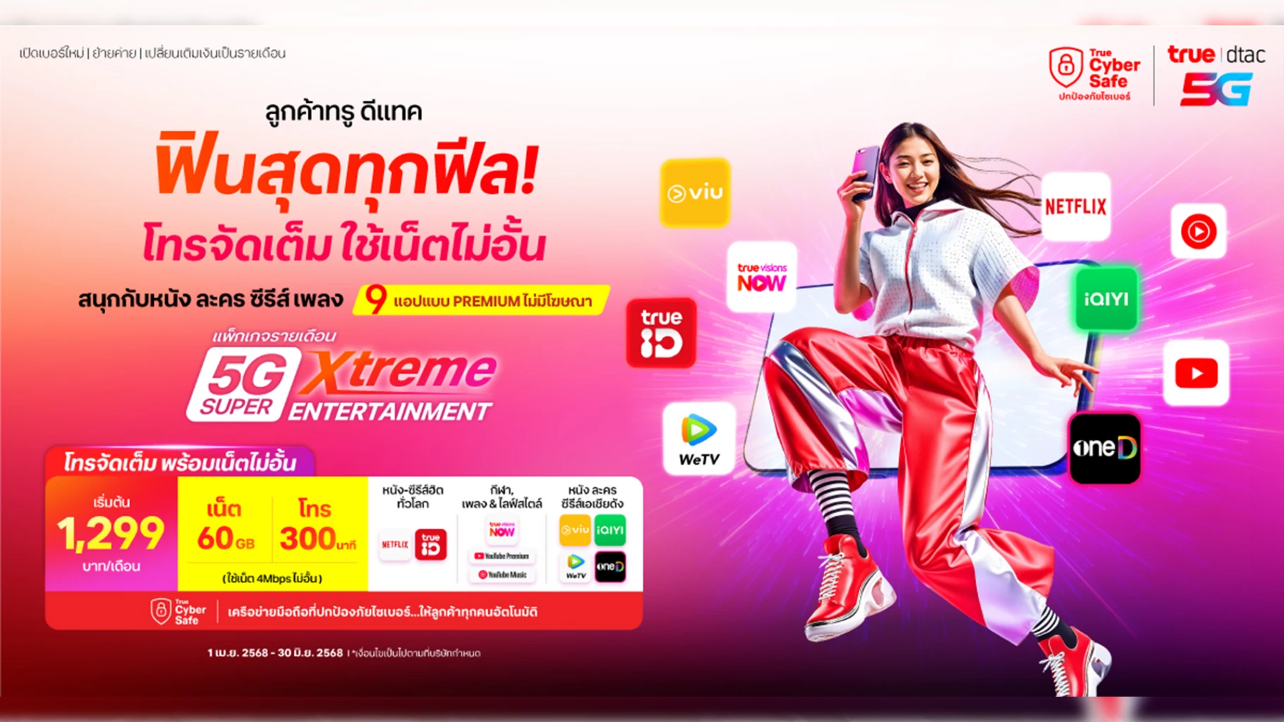 กรุงเทพฯ 14 พฤษภาคม 2568 – ทรู เปิดปรากฏการณ์ใหม่ของวงการบันเทิงดิจิทัล ให้ลูกค้าทรู ดีแทค ฟินสุดทุกฟีล กับแพ็กเกจมือถือรายเดือนใหม่ล่าสุด “แพ็กเกจ 5G Super Xtreme Entertainment” มาพร้อม “แพ็กเกจเสริม Xtreme Combo” รวมคอนเทนต์พรีเมียมจาก 9 แอป ดังระดับโลก อย่าง Netflix, YouTube Premium, YouTube Music , TrueVisions NOW, Viu, iQIYI, WeTV, TrueID และ oneD ตอบโจทย์ทุกสาย ความบันเทิง ไม่ว่าจะเป็นซีรีส์เกาหลี-จีน-ไทย หนังฮอลลีวูด คลิป ละคร เพลง ไลฟ์สไตล์ หรือจะเป็นรายการกีฬา ให้ดูได้แบบพรีเมียมจุใจในราคาสุดคุ้ม มาพร้อมเน็ตเร็ว แรงไม่มีสะดุด และสิทธิพิเศษมากมาย สะดวกเกินใคร จ่ายรวมบิลครั้งเดียว ไม่ต้องแยกจ่ายทุกแอปให้ยุ่งยาก