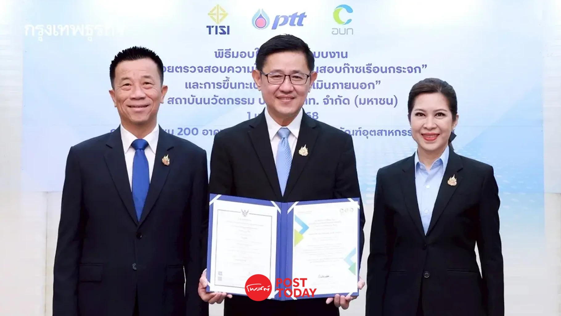 บริษัท ปตท. จำกัด (มหาชน) (ปตท.) โดยสถาบันนวัตกรรม ปตท. ได้รับรองระบบงานหน่วยตรวจสอบความใช้ได้และทวนสอบก๊าซเรือนกระจกตามมาตรฐาน ISO 14065:2020 และ ISO/IEC 17029:2019 จากสำนักงานมาตรฐานผลิตภัณฑ์อุตสาหกรรม (สมอ.)
