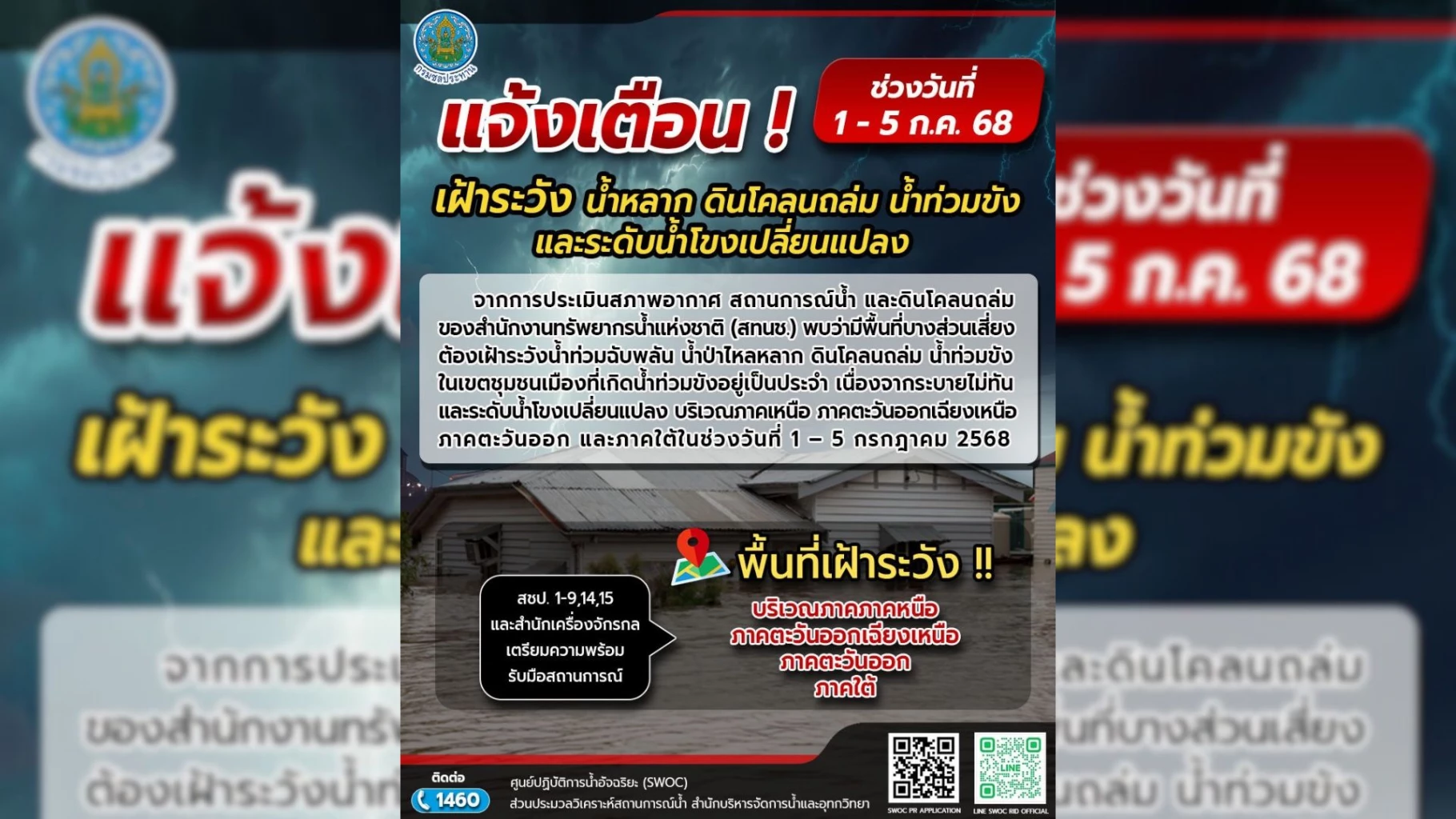 ศูนย์ปฏิบัติการน้ำอัจฉริยะ (SWOC) กรมชลประทาน เปิดเผยว่า จากประกาศของสำนักงานทรัพยากรน้ำแห่งชาติ (สทนช.) ฉบับที่ 9/2568 แจ้งเตือนให้ประชาชนในพื้นที่เสี่ยงเฝ้าระวังน้ำหลาก น้ำท่วมฉับพลัน น้ำท่วมขัง และดินโคลนถล่มในช่วงวันที่ 1–5 กรกฎาคม 2568 จากอิทธิพลฝนตกสะสมโดยเฉพาะพื้นที่เสี่ยง รวมถึงพื้นที่ลุ่มต่ำใกล้ลำน้ำสายหลัก และจังหวัดริมแม่น้ำโขงที่อาจได้รับผลกระทบจากระดับน้ำโขงเปลี่ยนแปลง