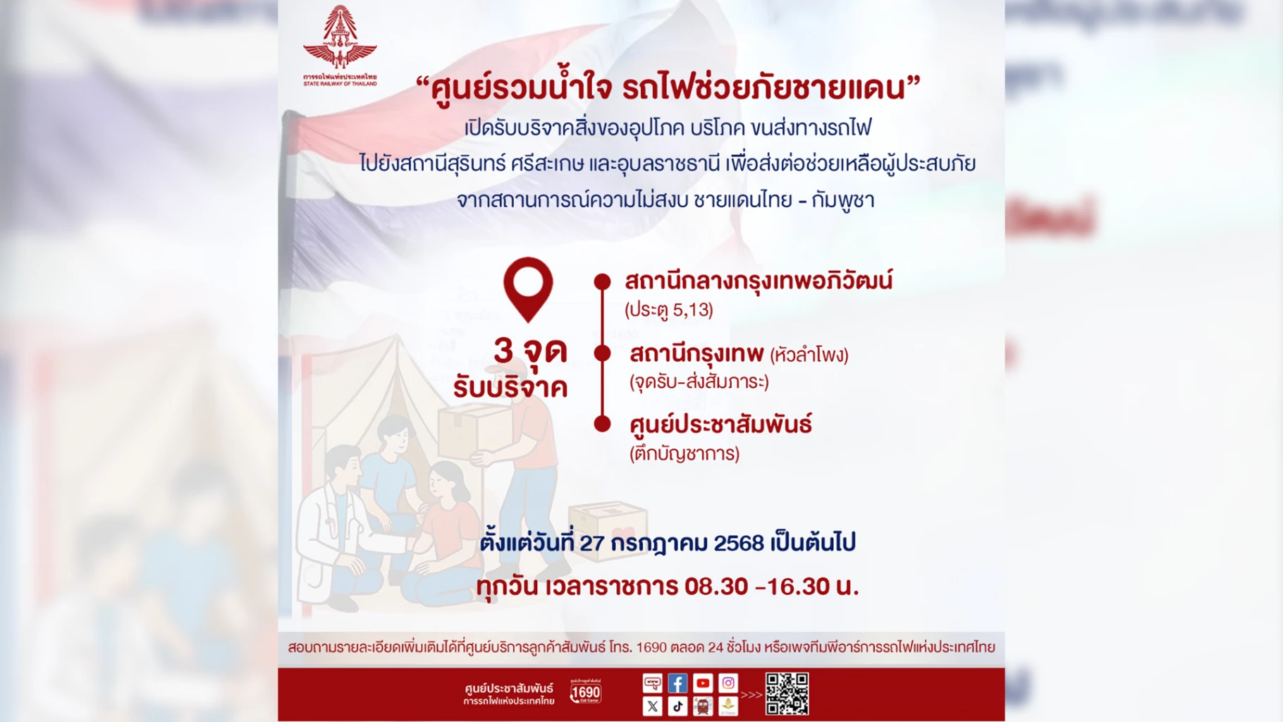 การรถไฟฯ เปิดศูนย์รวมน้ำใจ 3 จุดหลัก รับบริจาคช่วยผู้ประสบภัยชายแดนไทย-กัมพูชา พร้อมลำเลียงสิ่งของโดยขบวนรถไฟเริ่ม 27 ก.ค. 68 เป็นต้นไป