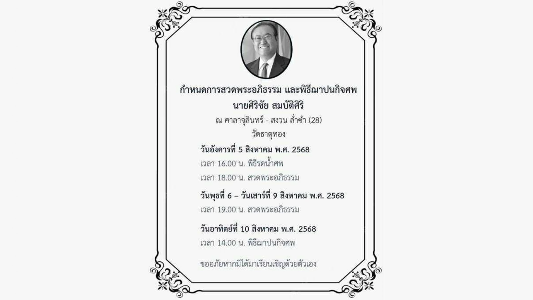 ครอบครัว แจ้งกำหนดสวดอภิธรรม ฌาปนกิจ ศิริชัย สมบัติศิริ ประธานกรรมการ น้ำตาลบุรีรัมย์-บอร์ด LH Bank