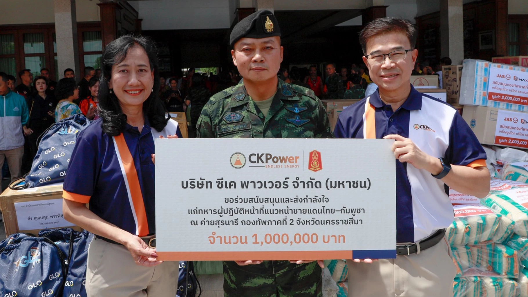 บริษัท ซีเค พาวเวอร์ จำกัด (มหาชน) หรือ CKP โดย นายวรพจน์ อุชุไพบูลย์วงศ์ กรรมการบริหาร พร้อมด้วย นางมัณทนา เอื้อกิจขจร รองกรรมการผู้จัดการอาวุโส งานวางแผนธุรกิจ มอบเงินสนับสนุนจำนวน 1,000,000 บาท (หนึ่งล้านบาทถ้วน) ร่วมสนับสนุนภารกิจของกองกำลังทหารชายแดนในการปฏิบัติหน้าที่ปกป้องอธิปไตยและความมั่นคงของประเทศ