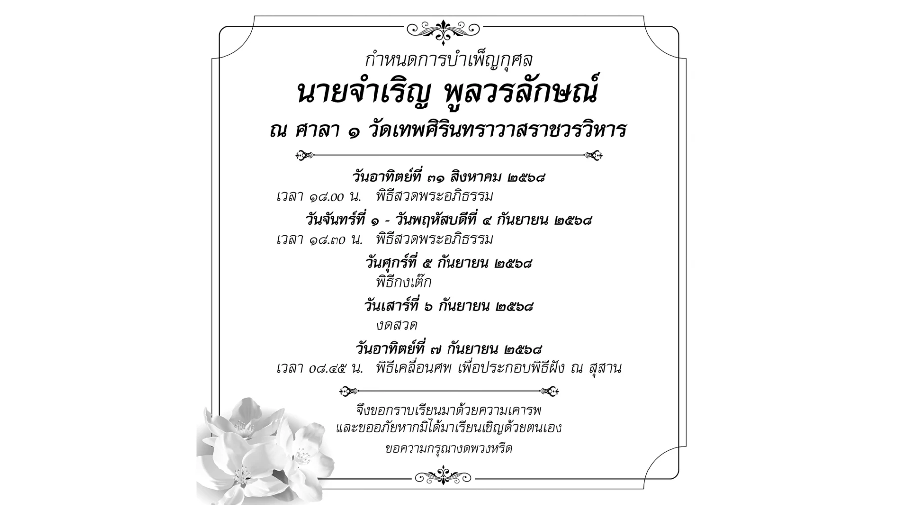 ครอบครัวพูลวรลักษณ์แจ้งกำหนดการบำเพ็ญกุศล นายจำเริญ พูลวรลักษณ์ ณ วัดเทพศิรินทราวาสฯ ตั้งแต่ 31 ส.ค.–7 ก.ย. 2568 พร้อมขอความกรุณางดพวงหรีด