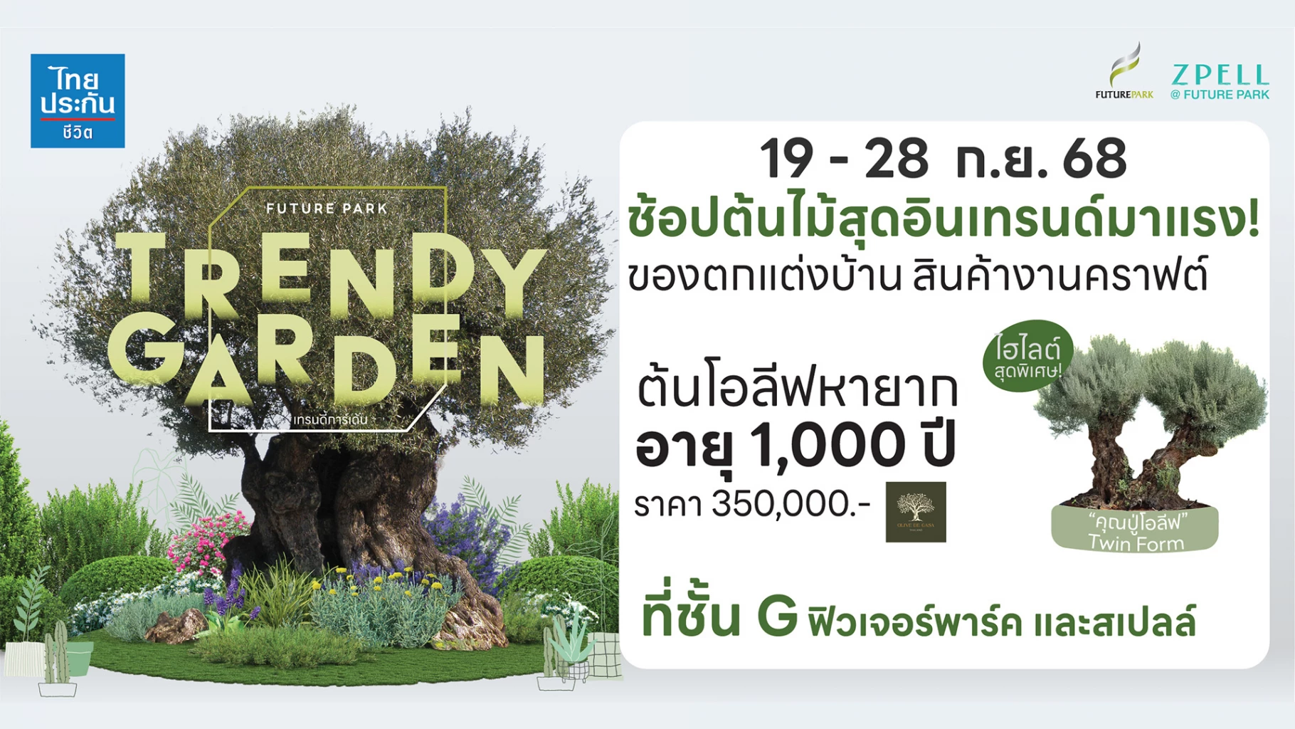 ฟิวเจอร์พาร์คจัดงาน “Trendy Garden” รวบรวมพันธุ์ไม้และของแต่งบ้านสุดเก๋ พร้อมจัดแสดงต้นโอลีฟพันปีสุดหายาก เพื่อสร้างแรงบันดาลใจและเติมเต็มพื้นที่สีเขียว