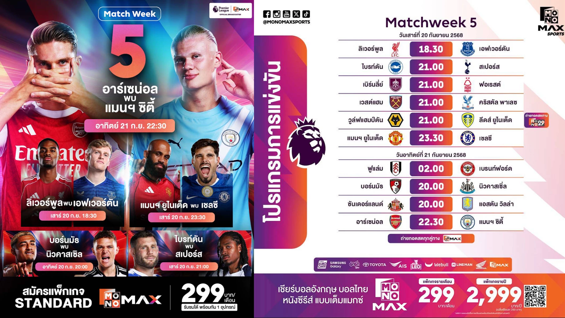 เริ่มต้นใน วันเสาร์ที่ 20 กันยายน 2568 เวลา 18:30 น. แฟนบอลจะได้พบกับศึกแห่งศักดิ์ศรีเมืองลิเวอร์พูลหรือ “เมอร์ซีย์ไซด์ดาร์บี้” เมื่อ ลิเวอร์พูล เปิดรังแอนฟิลด์ต้อนรับการมาเยือนของคู่ปรับตลอดกาลอย่าง เอฟเวอร์ตัน เกมใหญ่ที่ไม่เคยขาดสีสันและดราม่า รับชมทาง Monomax จากนั้น เวลา 21.00 น. จะมีโปรแกรมพร้อมกันถึงสี่คู่ โดย ไบรท์ตัน แอนด์ โฮฟ อัลเบี้ยน เตรียมดวลเกมรุกสุดมันส์กับ ท็อตแน่ม ฮ็อตสเปอร์ รับชมทาง Monomax ขณะที่ เบิร์นลี่ย์ เปิดบ้านรับการมาเยือนของ น็อตติ้งแฮม ฟอเรสต์ ในเกมที่ทั้งสองทีมต่างต้องการแต้มเพื่อขยับหนีโซนอันตราย รับชมทาง Monomax ในเวลาเดียวกัน เวสต์แฮม ยูไนเต็ด จะลงเล่นศึกดาร์บี้เมืองหลวงกับ คริสตัล พาเลซ ที่ขึ้นชื่อเรื่องเกมสวนกลับอันตราย รับชมทาง Monomax ส่วนอีกคู่ที่น่าจับตาคือการพบกันระหว่าง วูล์ฟแฮมป์ตัน วันเดอเรอร์ส และ ลีดส์ ยูไนเต็ด โดยคู่นี้จะถ่ายทอดสดพิเศษทั้งทาง Monomax และ ช่อง MONO29 ความมันส์ยังไม่จบเพราะ เวลา 23.30 น. จะเป็นคู่เอกประจำวันเสาร์ที่แฟนบอลทั่วโลกตั้งตารอ นั่นคือการดวลกันระหว่าง แมนเชสเตอร์ ยูไนเต็ด และ เชลซี ที่สนามโอลด์แทรฟฟอร์ด เกมบิ๊กแมตช์ที่เดิมพันคะแนนและศักดิ์ศรี รับชมทาง Monomax จากนั้นต่อด้วย เวลา 02:00 น. ของวันอาทิตย์ที่ 21 กันยายน 2568 (คืนวันเสาร์ที่ 20 กันยายน 2568) ศึกดาร์บี้แห่งลอนดอนตะวันตกระหว่าง ฟูแล่ม กับ เบรนท์ฟอร์ด ที่ต่างต้องการสามแต้มเพื่อขยับอันดับกลางตาราง รับชมได้ทาง Monomax