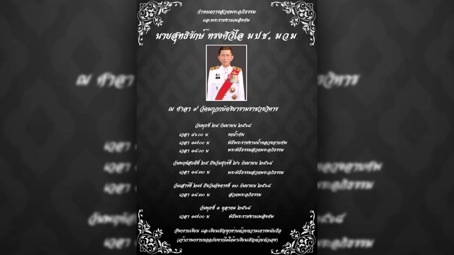 กำหนดการสวดพระอภิธรรมและพระราชทานเพลิงศพ นายสุทธิรักษ์ ทรงศิวิไล เลขาธิการศาลรัฐธรรมนูญ ณ ศาลา 9 วัดมกุฎกษัตริยารามราชวรวิหาร