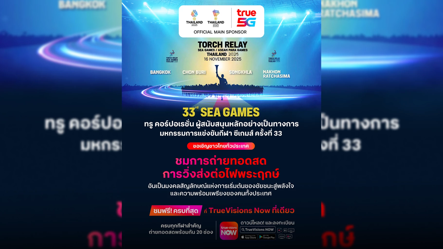 ทรู คอร์ปอเรชั่น ผู้สนับสนุนหลัก ซีเกมส์ 2025 ชวนคนไทยร่วมเป็นประวัติศาสตร์ชมสด "วิ่งอัญเชิญไฟพระฤกษ์" จาก 4 จังหวัดเจ้าภาพ ในวันที่ 16 พ.ย. 68 ตั้งแต่ 07.00 น. ชมฟรี! บนแอปพลิเคชัน TrueVisions Now เท่านั้น