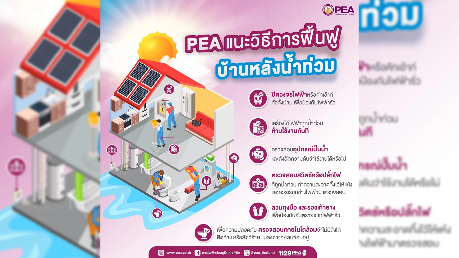 PEA แนะประชาชนที่น้ำลดแล้ว ให้ สวมถุงมือ/รองเท้ายาง ก่อน ปลดคัตเอาท์ และ ตรวจสอบ อุปกรณ์ไฟฟ้า/สายไฟที่ถูกน้ำท่วม ห้ามใช้งานเครื่องใช้ไฟฟ้าทันที และให้ช่างผู้ชำนาญตรวจสอบซ่อมแซมเพื่อ ความปลอดภัย