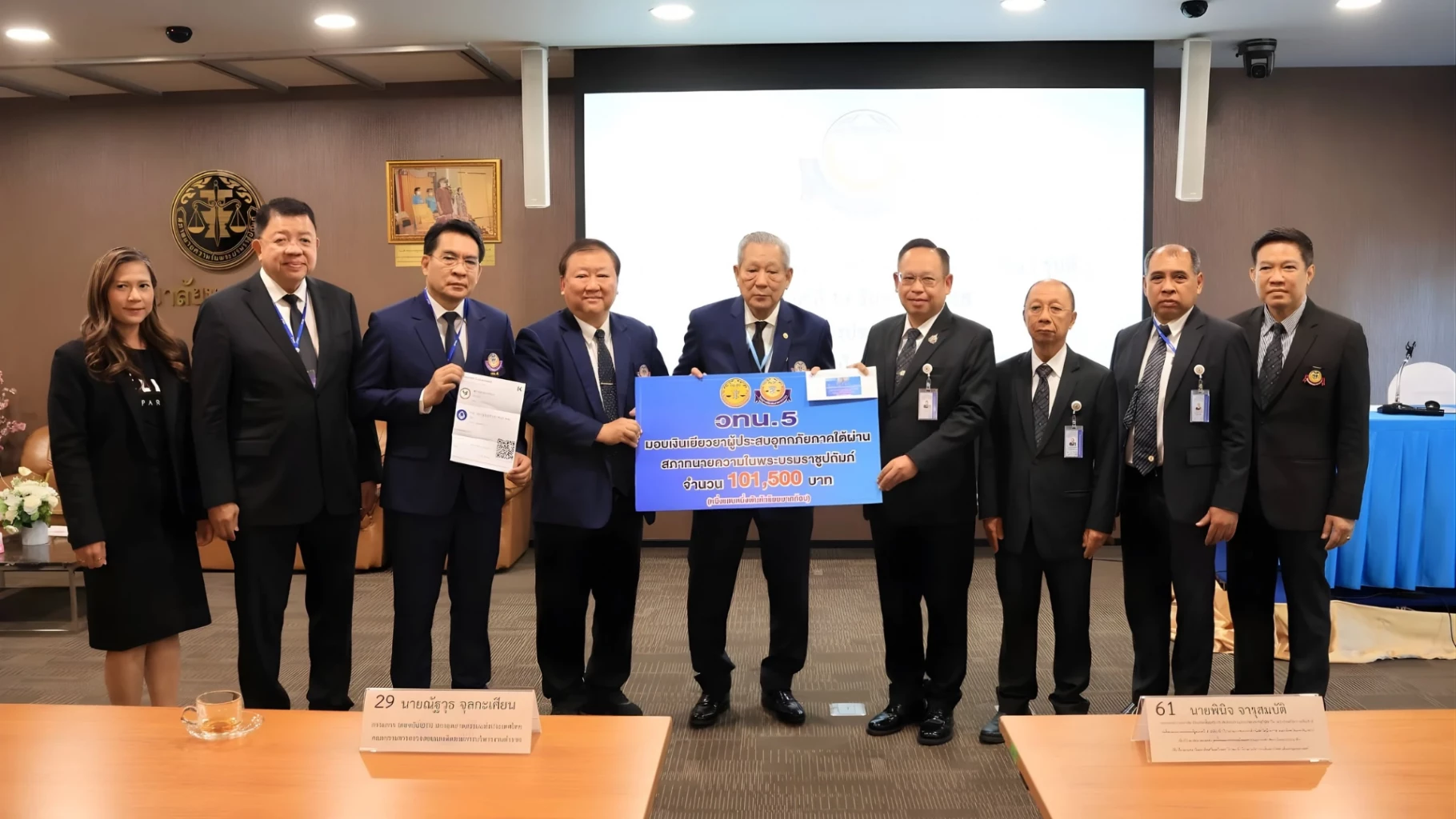 เมื่อวันที่ 19 ธันวาคม 2568 นาย พินิจ จารุสมบัติ ในฐานะประธานนักศึกษาหลักสูตร "การบริหารเชิงนิติศาสตร์ระดับสูง" (วทน.) รุ่นที่ 5 เป็นตัวแทนในการมอบเงิน จำนวน 101,500 บาท ผ่าน ดร.ธนพล คงเจี้ยง นายกสภาทนายความในพระบรมราชูปถัมภ์ และผู้อำนวยการหลักสูตรวิทยาลัยทนายความ เพื่อนำไปช่วยเยียวยาฟื้นฟูประชาชนผู้ประสบภัยน้ำท่วมในพื้นที่ภาคใต้