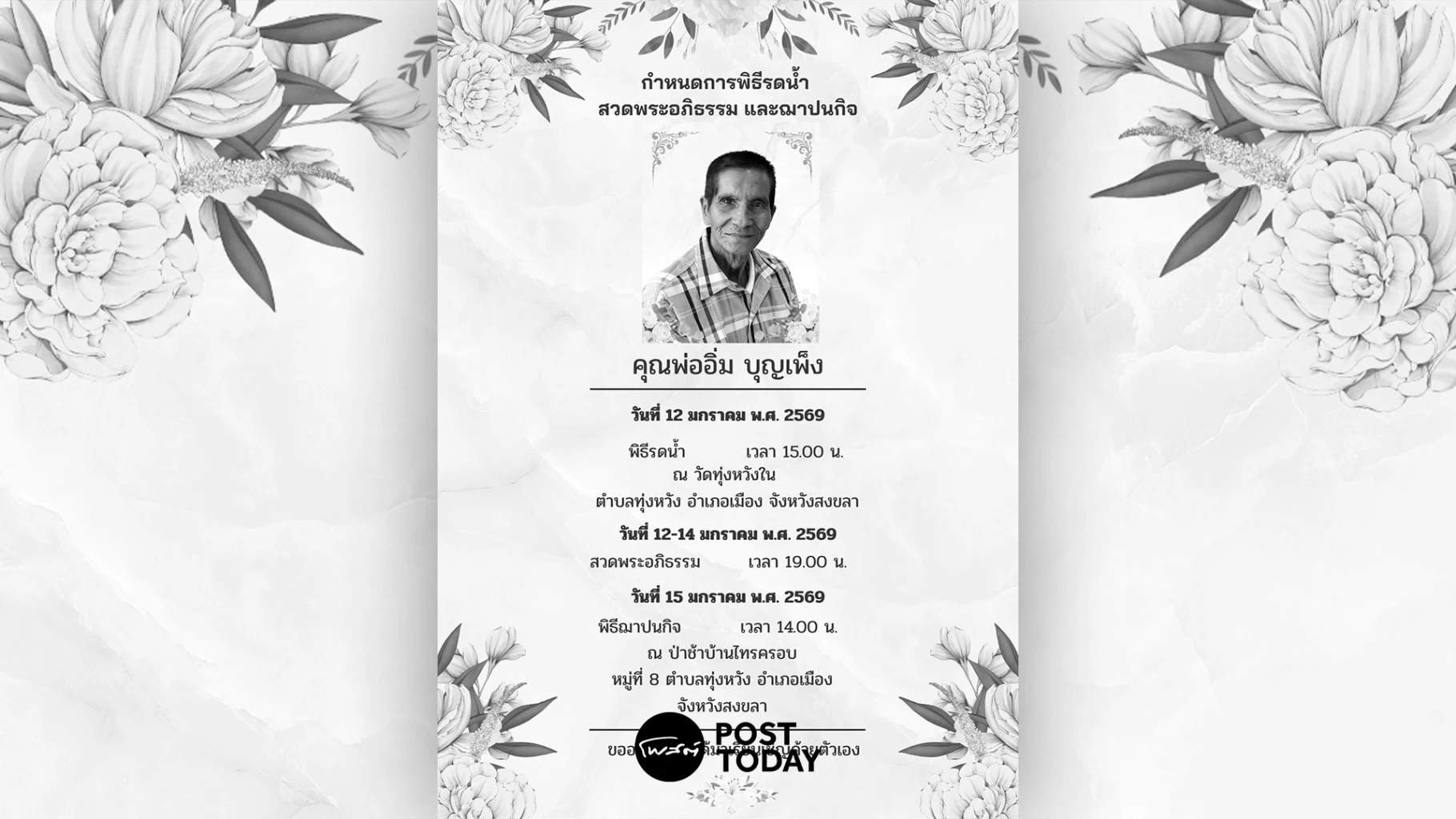 ด้วยความอาลัย กำหนดการพิธีรดน้ำ สวดพระอภิธรรม และฌาปนกิจ คุณพ่ออิ่ม บุญเพ็ง