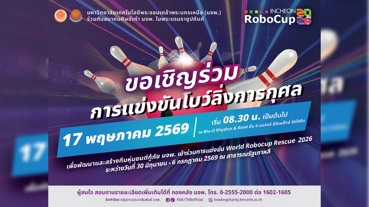 มหาวิทยาลัยเทคโนโลยีพระจอมเกล้าพระนครเหนือ (มจพ.) ร่วมกับสมาคมศิษย์เก่ามหาวิทยาลัยเทคโนโลยีพระจอมเกล้าพระนครเหนือในพระบรมราชูปถัมภ์ และเครือข่ายความร่วมมือทางวิชาการ จัดการแข่งขันโบว์ลิ่งการกุศล เพื่อหารายได้พัฒนาและสร้างทีมหุ่นยนต์กู้ภัย มจพ. เข้าร่วมการแข่งขัน World Robocup Rescue 2026 ณ สาธารณรัฐเกาหลี ระหว่างวันที่ 30 มิถุนายน – 6 กรกฎาคม 2569 โดยจัดการแข่งขันโบว์ลิ่งการกุศล ในวันอาทิตย์ที่ 17 พฤษภาคม 2569 เวลา 08.30 น. เป็นต้นไป ณ blu-O-RHYTHM & BOWL ชั้น 4 รัชโยธิน ชิงถ้วยรางวัลเกียรติยศ ดังนี้