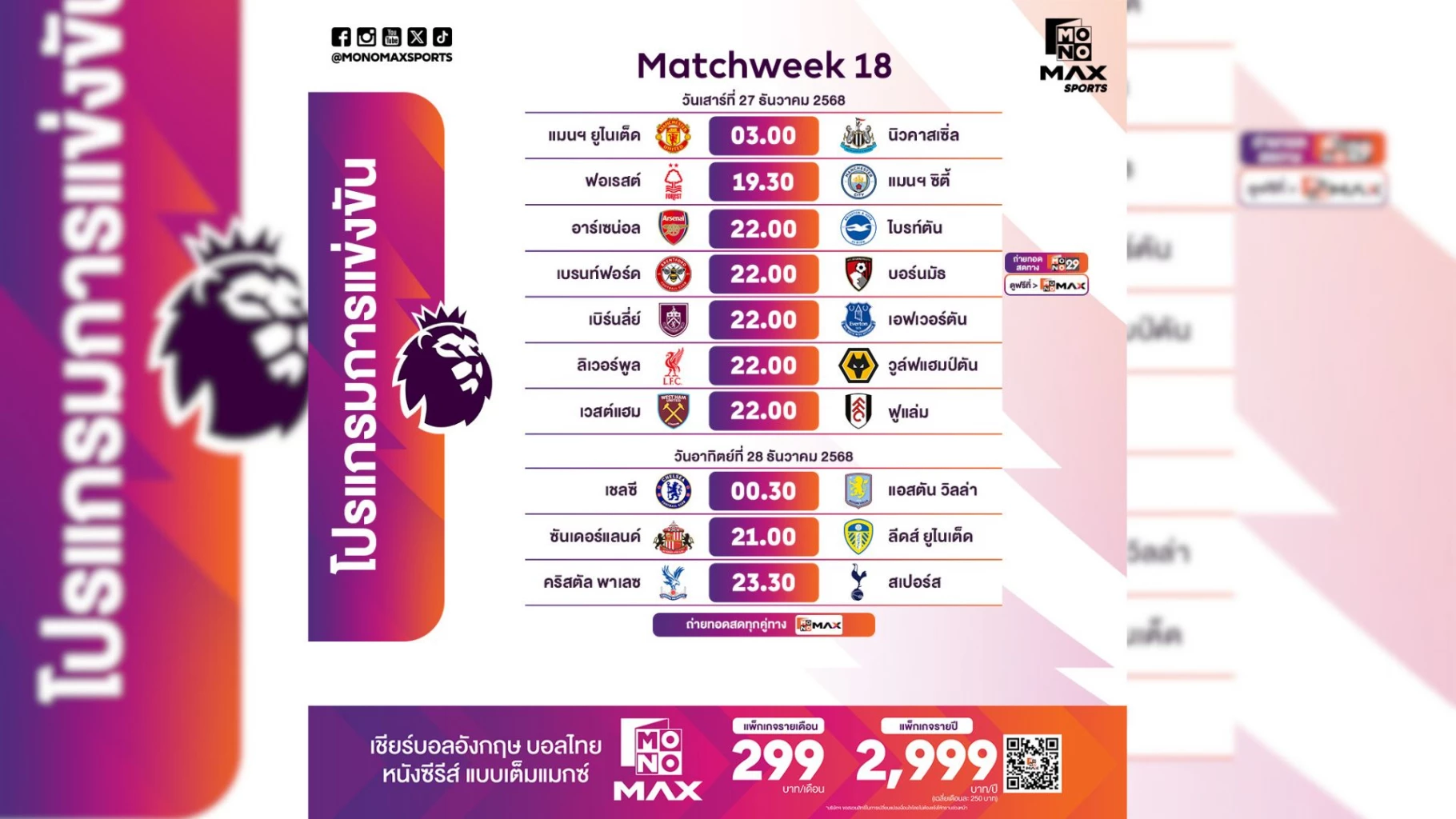โปรแกรมพรีเมียร์ลีกอังกฤษช่วงโค้งปลายปี ระหว่างวันเสาร์ที่ 27 ธันวาคม 2568 และ วันอาทิตย์ที่ 28 ธันวาคม 2568 เดือดทุกสนาม โดยหลายทีมในกลุ่มหัวตารางยังคงขับเคี่ยวกันอย่างสูสี ให้แฟนบอลได้ลุ้นกันยาวตลอดสุดสัปดาห์ โดย Monomax ถ่ายทอดสดครบทุกคู่และบางคู่ผ่านหน้าจอ ช่อง MONO29