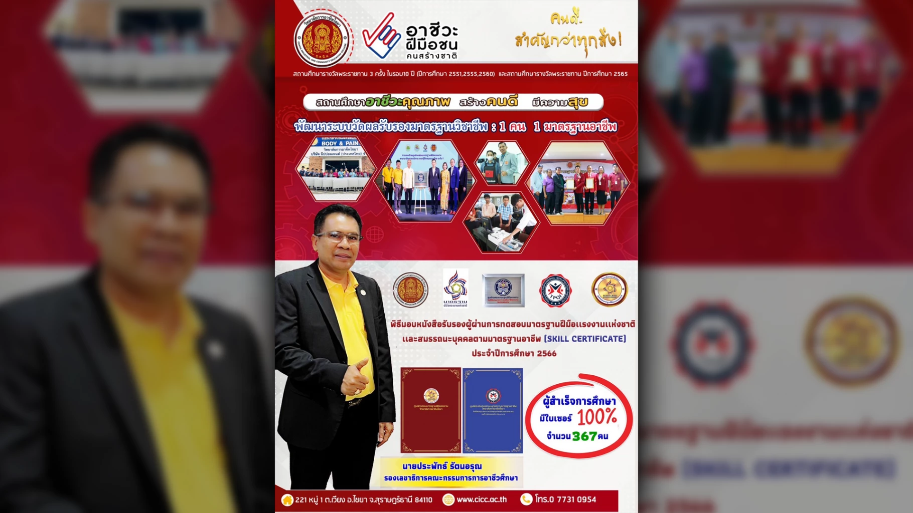 วิทยาลัยการอาชีพไชยา มอบหนังสือรับรองผู้ผ่านการทดสอบมาตรฐานฝีมือแรงงานแห่งชาติ และสมรรถนะบุคคลตามมาตรฐานอาชีพ (Skill Certificate) พัฒนาระบบวัดผลรับรองมาตรฐานวิชาชีพ 1 คน 1 มาตรฐานวิชาชีพ