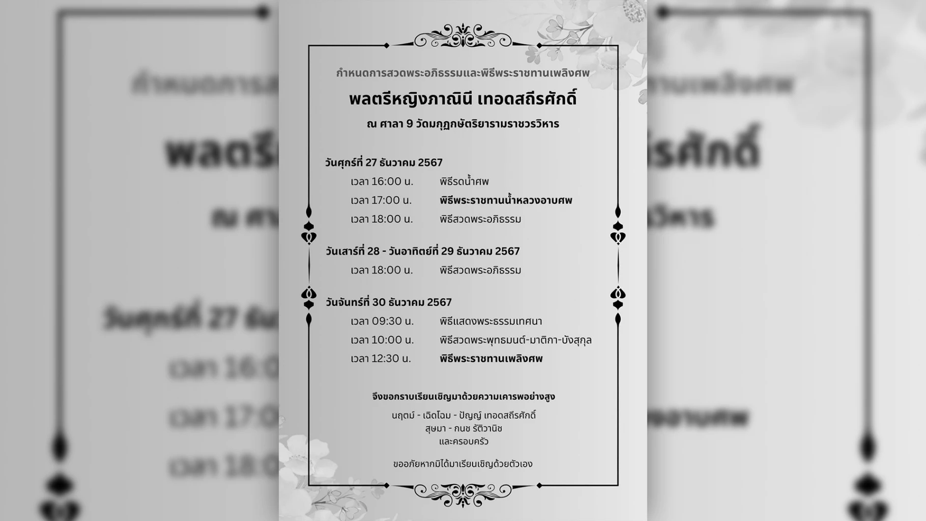 ครอบครัวเทอดสถีรศักดิ์ ขอเรียนเชิญร่วมพิธีสวดพระอภิธรรมและพระราชทานเพลิงศพ พลตรีหญิงภาณินี เทอดสถีรศักดิ์ ณ ศาลา 9 วัดมกุฏกษัตริยารามราชวรวิหาร ระหว่างวันที่ 27-30 ธันวาคม 2567