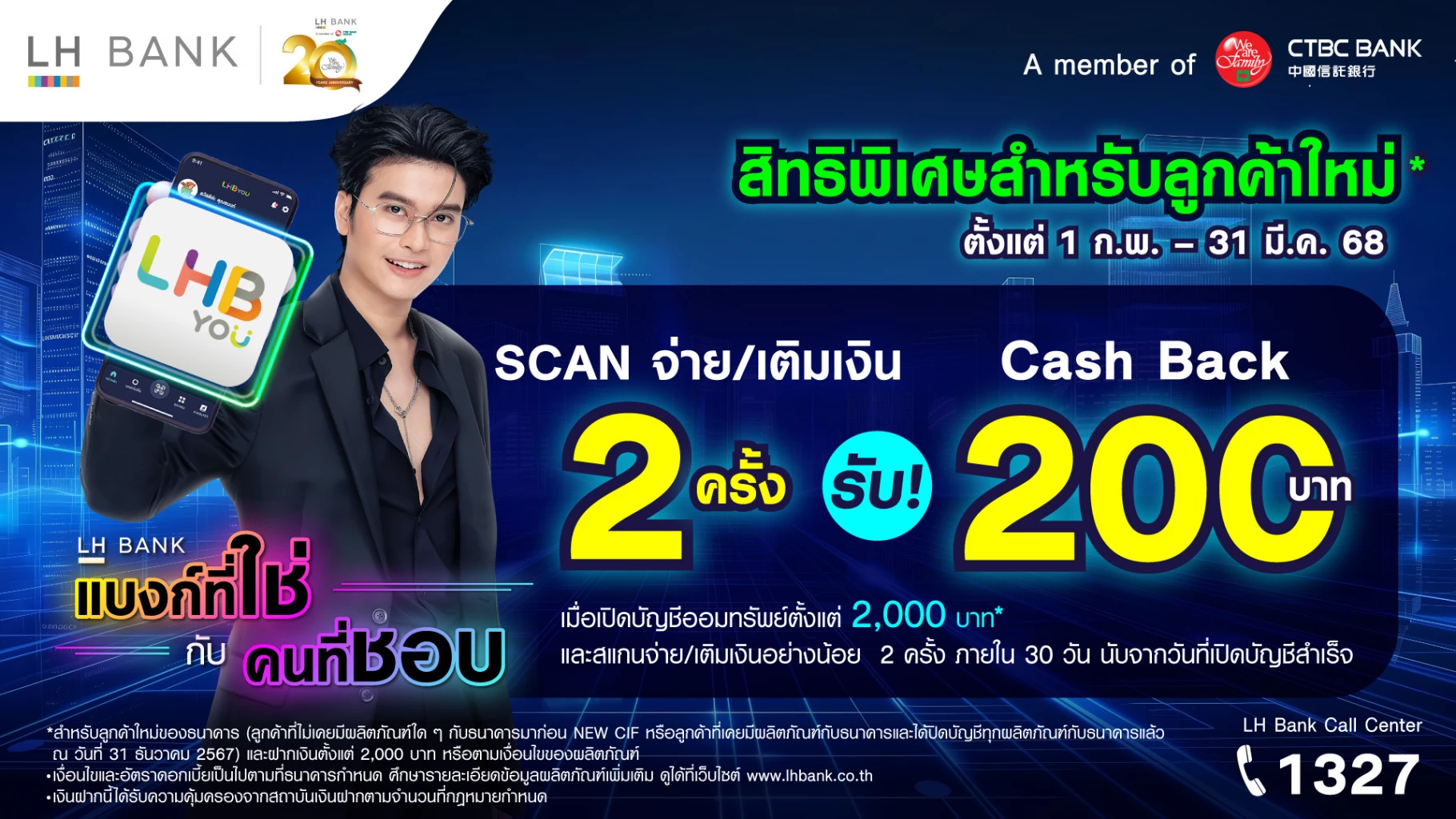 ธนาคารแลนด์ แอนด์ เฮ้าส์ จำกัด (มหาชน) หรือ LH Bank ฉลองก้าวสู่ปีที่ 20 ของธนาคาร ชวนลูกค้ารับผลตอบแทนสุดคุ้มค่า ต่อยอดทุกเป้าหมายทางการเงิน กับแคมเปญ LH Bank แบงก์ที่ใช่ กับคนที่ชอบ ออกโปรโมชันพิเศษสำหรับลูกค้าใหม่ รับ Cash Back เงินคืน 200 บาท เมื่อเปิดบัญชีเงินฝากออมทรัพย์ตั้งแต่ 2,000 บาทขึ้นไป พร้อมทำรายการสแกนจ่ายหรือเติมเงินผ่านแอปพลิเคชัน LHB You อย่างน้อย 2 ครั้ง ภายใน 30 วันนับจากวันที่เปิดบัญชีสำเร็จ ตั้งแต่วันนี้ – 31 มีนาคม 2568