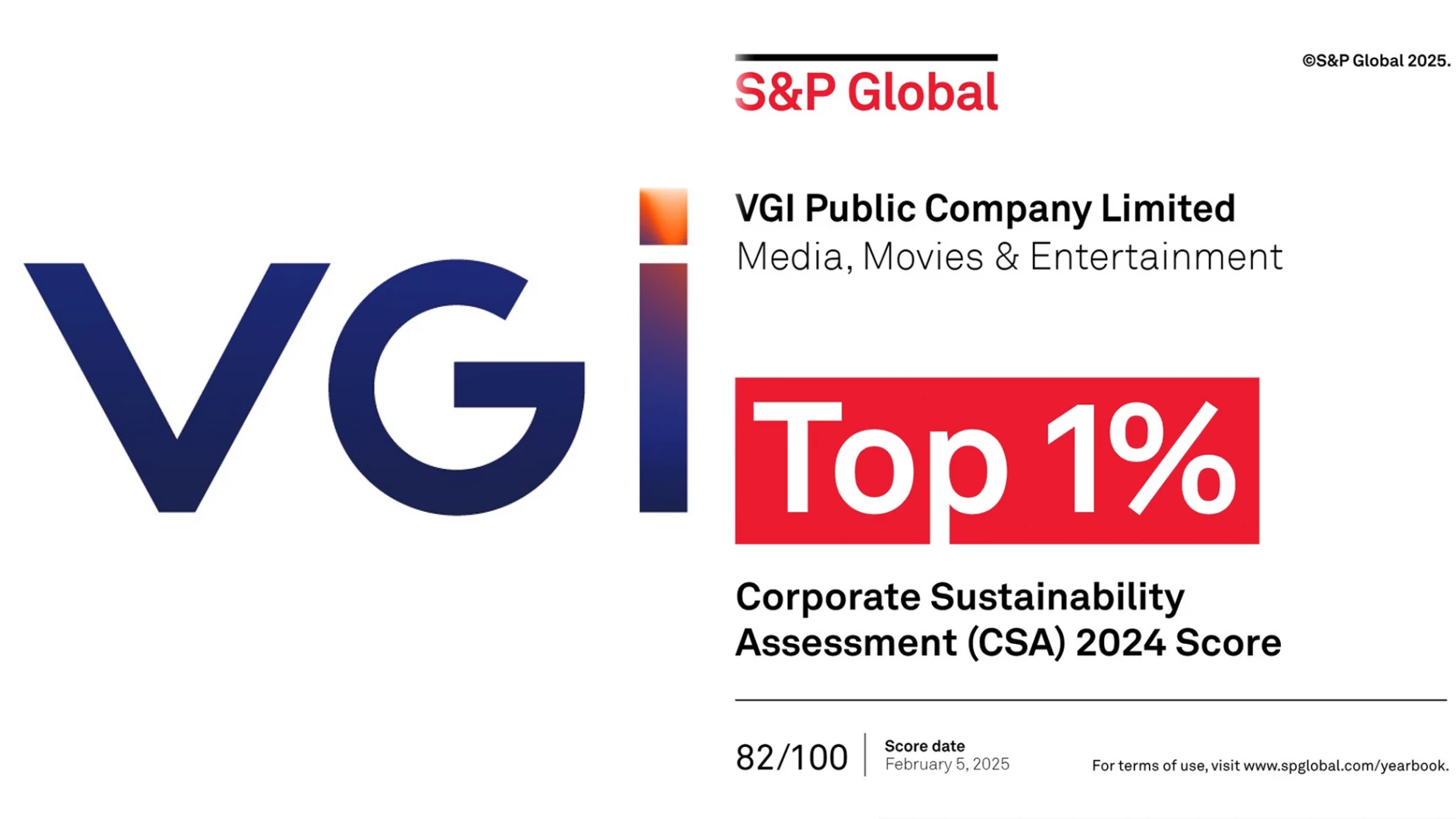 S&P Global เป็นหนึ่งในดัชนีชั้นนำระดับโลกที่ประเมินการดำเนินธุรกิจตามแนวทางความยั่งยืน โดยในปีนี้มีบริษัทจดทะเบียนกว่า 177 แห่ง ในอุตสาหกรรมสื่อเข้าร่วมการประเมิน (2024 Corporate Sustainability Assessment) แต่มีเพียง 4 บริษัทเท่านั้น ที่ได้รับการจัดอันดับใน The Sustainability Yearbook 2025 ซึ่ง VGI เป็นหนึ่งในบริษัทที่ได้รับการยอมรับสูงสุด กรรมการผู้อำนวยการใหญ่ กล่าวเพิ่มเติม